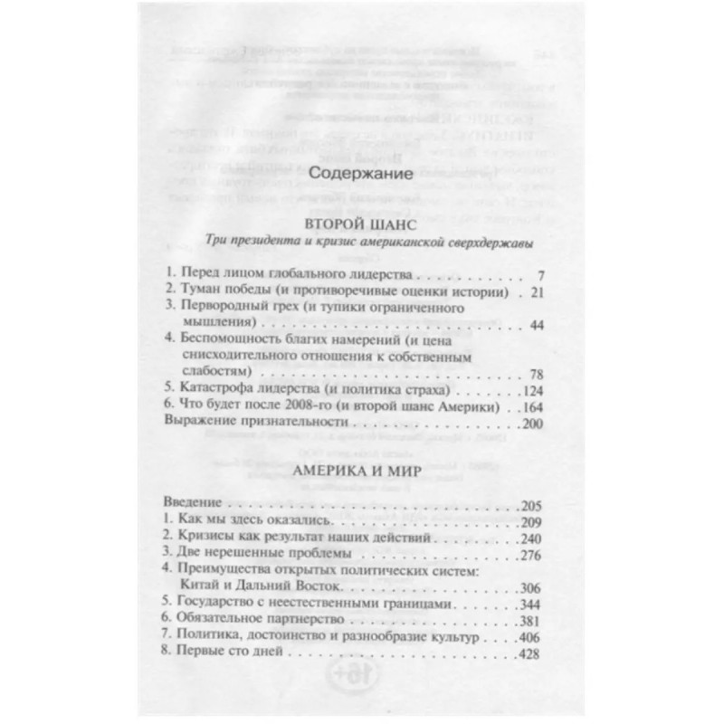 ISBN 9785-1798-26408. Второй шанс. Америка и мир. В книге Второй шанс автор дает глубокий анализ внешнеполитической деятельности трех президентов США - Буша-старшего, Клинтона и Буша-младшего, ставших после исчезновения двухполюсного мира глобальными лидерами. По мнению З. Бжезинского, за время, прошедшее после окончания холодной войны, США уже растратили значительную часть своей мощи, но по-прежнему обладают достаточным потенциалом, чтобы использовать, несмотря на противодействующие факторы, второй и последний шанс на глобальное лидерство.