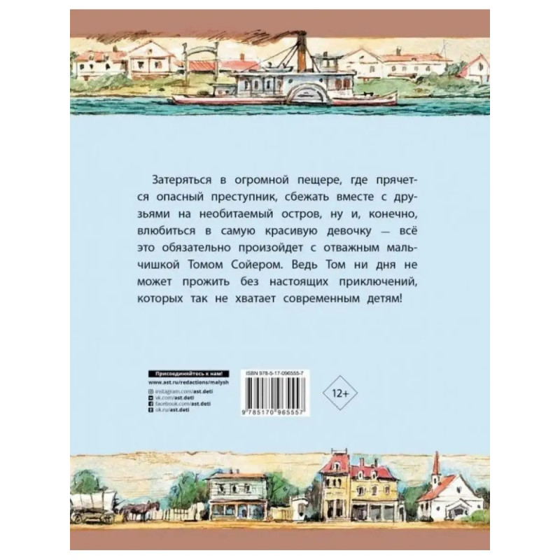 ISBN 9785-17096-5557. Приключения Тома Сойера. Знаменитая повесть Марка Твена о приключениях Тома Сойера всегда входила в основной список чтения любого ребёнка. Жизнь этого мальчишки неизменно вызывает восхищение у детей ХХ и ХХI века, ведь им и во сне не увидеть столько свободы и приключений!Для среднего школьного возраста.