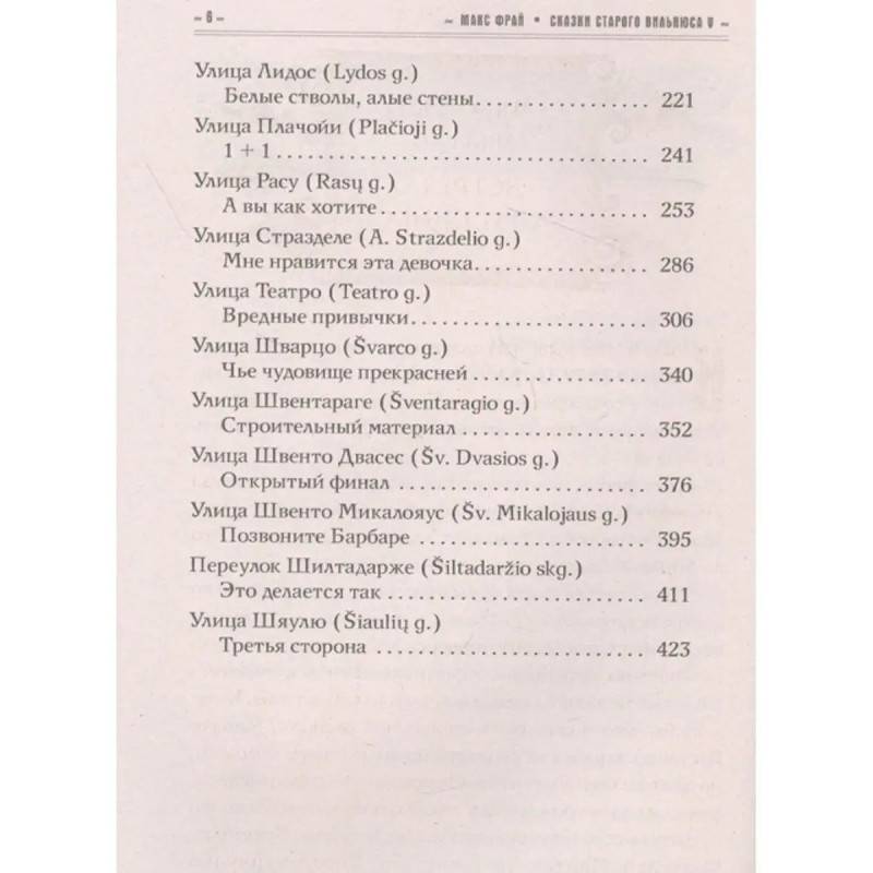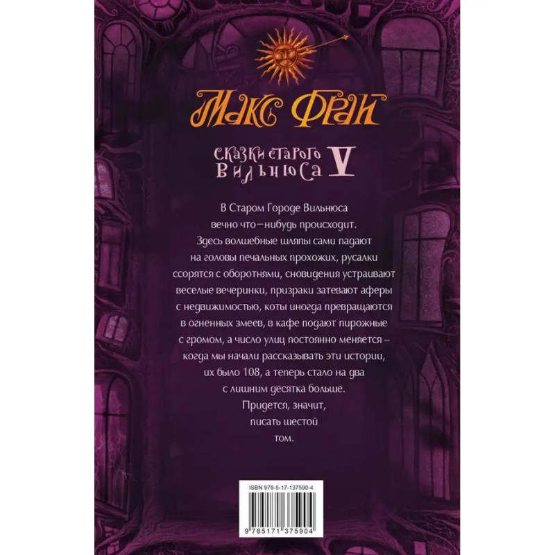 ISBN 9785-17137-5904. Сказки старого Вильнюса V. Макс Фрай. Макс Фрай - самый загадочный писатель в пространстве современной русскоязычной литературы. Культовый автор последнего десятилетия, ставший самостоятельным брендом. Автор ряда литературных проектов, в числе которых цикл фантастических бестселлеров, большой цикл эссе о литературе и искусстве, сборники потрясающих рассказов, события в которых развиваются на старых улочках Вильнюса, и многое-многое другое... Макс Фрай автор, книги которого ищут, перечитывают и передают из рук в руки. "Сказки старого Вильнюса V" - пятая книга из цикла Сказок. В книге "Сказки старого Вильнюса V" всё уже вроде знакомо и привычно, но порой удивляет и вдохновляет. Мы вновь встречаемся с теми же волшебными и вымышленными персонажами, опять следим за судьбой потерявших себя людей, которых может спасти только магическое и необъяснимое событие. В Старом городе Вильнюса 108 улиц, и на каждой что-нибудь да происходит. Здесь возникают из ниоткуда выдуманные города, духам Нижнего Мира приносят в жертву горячий шоколад, деревьям читают сказки, чтобы лучше спалось зимой, за высокой стеной шумит невидимое море, а ангел смерти всегда готов прийти на помощь соседям, оказавшимся в беде. Для кого эта книга:Для тех, кто учиться замечать, насколько на самом деле прекрасна жизнь и мир вокруг. Для тех, кто любит путешествовать в своих мечтах и мыслях. Для тех, кто увлеченно наблюдает за событиями в жизни разных людей и подмечает что-то для своего жизненного опыта. Для тех, кто не безразличен и человечен в своих помыслах. Для тех, кому бывает грустно и одиноко. Для тех, кто от всей души верит в чудеса и добро. Для тех, кто собирает коллекцию с великолепным иллюстрированным оформлением.