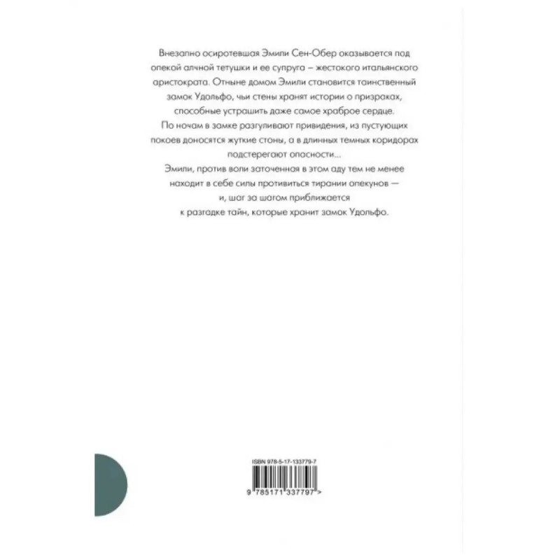 ISBN 9785-17133-7797. Удольфские тайны. Радклиф А. Внезапно осиротевшая Эмили Сен-Обер оказывается под опекой алчной тетушки и ее супруга жестокого итальянского аристократа. Отныне домом Эмили становится таинственный замок Удольфо, чьи стены хранят истории о призраках, способные устрашить даже самое храброе сердце. По ночам в замке разгуливают привидения, из пустующих покоев доносятся жуткие стоны, а в длинных темных коридорах подстерегают опасностиЭмили, против воли заточенная в этом аду тем не менее находит в себе силы противиться тирании опекунов и шаг за шагом приближается к разгадке тайн, которые хранит замок Удольфо.