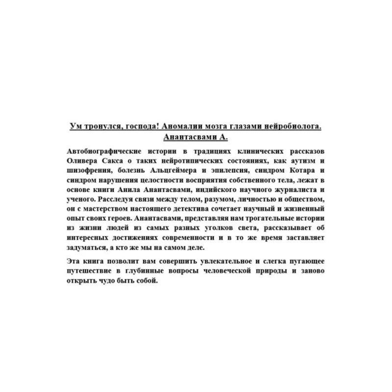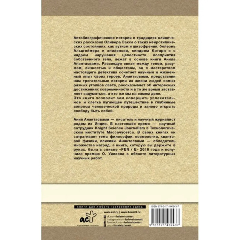 ISBN 9785-17146-2437. Ум тронулся, господа! Аномалии мозга глазами нейробиолога. Анантасвами А. Ум тронулся, господа! Аномалии мозга глазами нейробиолога. Анантасвами А. Автобиографические истории в традициях клинических рассказов Оливера Сакса о таких нейротипических состояниях, как аутизм и шизофрения, болезнь Альцгеймера и эпилепсия, синдром Котара и cиндром нарушения целостности восприятия собственного тела, лежат в основе книги Анила Анантасвами, индийского научного журналиста и ученого. Расследуя связи между телом, разумом, личностью и обществом, он с мастерством настоящего детектива сочетает научный и жизненный опыт своих героев. Анантасвами, представляя нам трогательные истории из жизни людей из самых разных уголков света, рассказывает об интересных достижениях современности и в то же время заставляет задуматься, а кто же мы на самом деле. Эта книга позволит вам совершить увлекательное и слегка пугающее путешествие в глубинные вопросы человеческой природы и заново открыть чудо быть собой. Переводчик: Иванова Е. А.