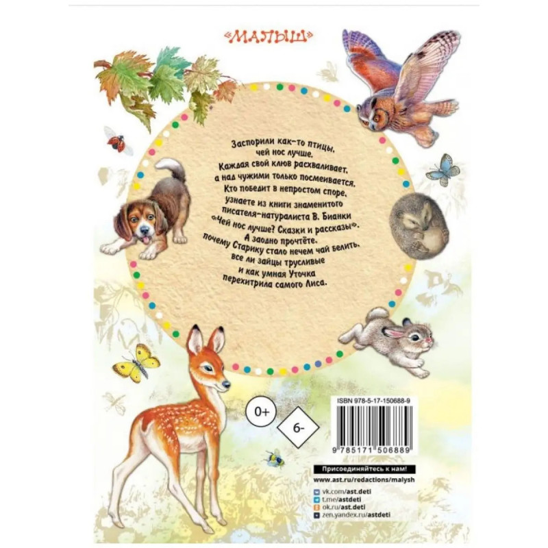 ISBN 9785-17150-6889. Чей нос лучше? Сказки и рассказы. Чей нос лучше? Сказки и рассказы. Бианки В. В., Цыганков И. А. Виталий Валентинович Бианки был большим знатоком родной природы. С раннего детства он наблюдал за удивительным миром животных, подмечал повадки зверей и птиц, записывал свои наблюдения в дневники. С помощью своих сказок и рассказов он учит детей любить окружающий мир, открывать его тайны, бережно относиться к нему. В книгу "Чей нос лучше? Сказки и рассказы" вошли такие знаменитые произведения В. Бианки, как "Чей нос лучше?", "Хитрый Лис и умная Уточка", "Хвосты", "Лесные разведчики" и многие другие. Рисунки И. Цыганкова. Для младшего школьного возраста.