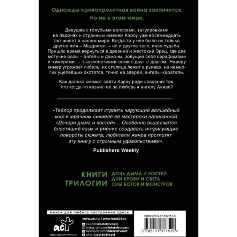 ISBN 9785-17137-7519. Дни крови и света. Тейлор Л. Девушка с голубыми волосами, татуировками на ладонях и странным именем Кэроу уже восемнадцать лет живет в нашем мире. Когда-то у нее было не только другое имя Мадригал но и другое тело, иная судьба. Пришло время вернуться в древний и жестокий Эрец, где две могучие расы ангелы и демоны, зовущие себя серафимами и химерами,- тысячелетиями воюют друг с другом. Народу химер угрожает гибель: их столица лежит в руинах, на немногих уцелевших охотятся, точно на зверей, ангелы-каратели.