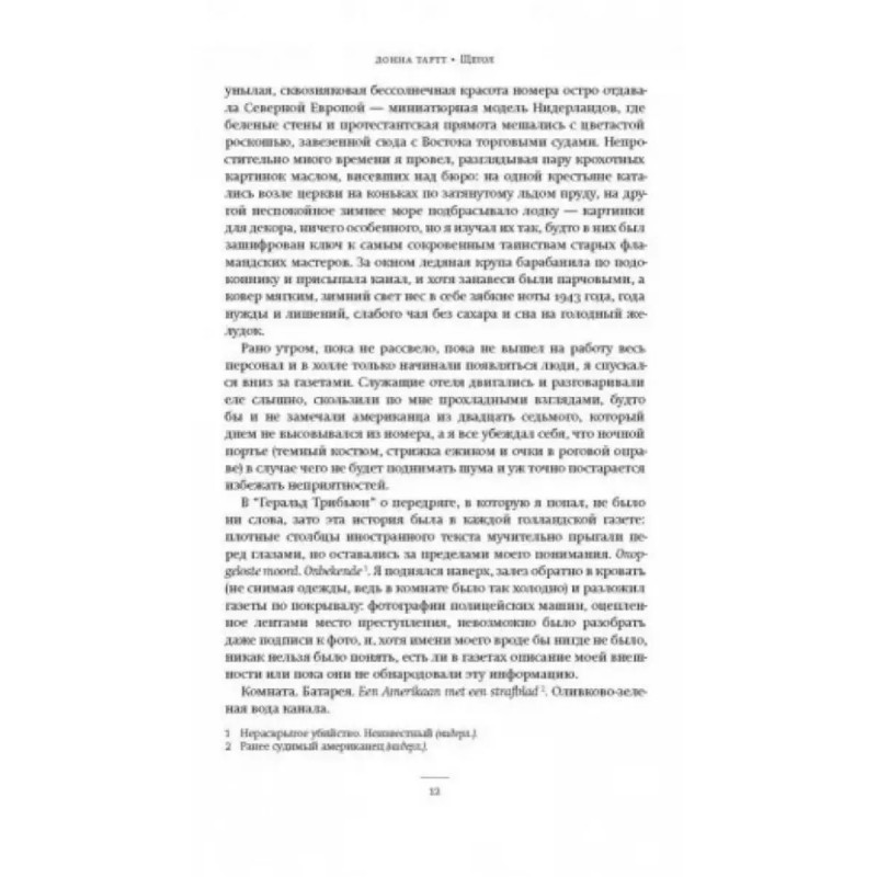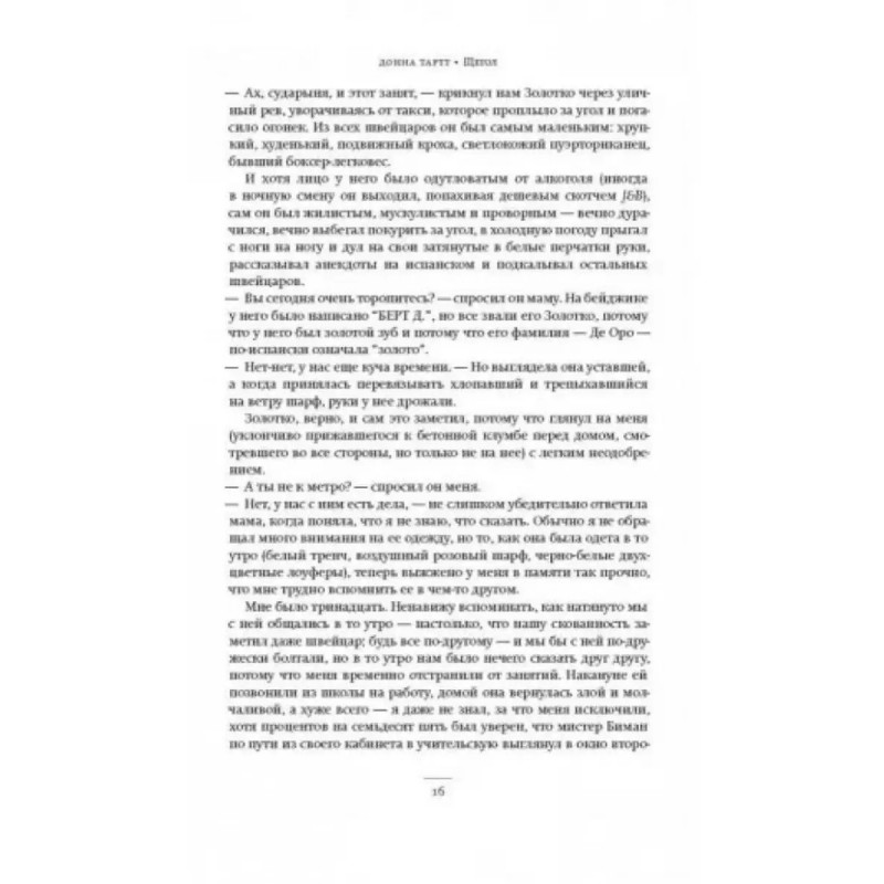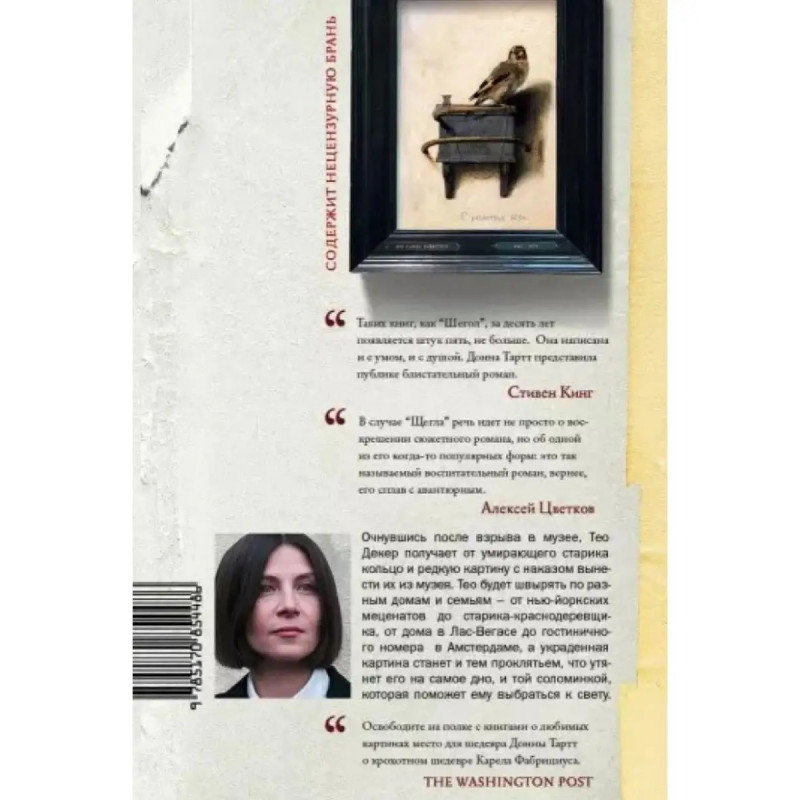 ISBN 9785-17085-4486. Щегол. Роман, который лауреат Пулитцеровской премии Донна Тартт писала более 10 лет, огромное эпическое полотно о силе искусства и о том, как оно подчас совсем не так, как нам того хочется способно перевернуть всю нашу жизнь. 13-летний Тео Декер чудом остался жив после взрыва, в котором погибла его мать. Брошенный отцом, без единой родной души на всем свете, он скитается по приемным домам и чужим семьям от Нью-Йорка до Лас-Вегаса, и его единственным утешением, которое, впрочем, чуть не приводит к его гибели, становится украденный им из музея шедевр голландского старого мастера.