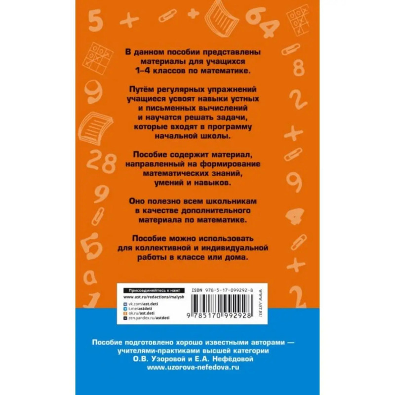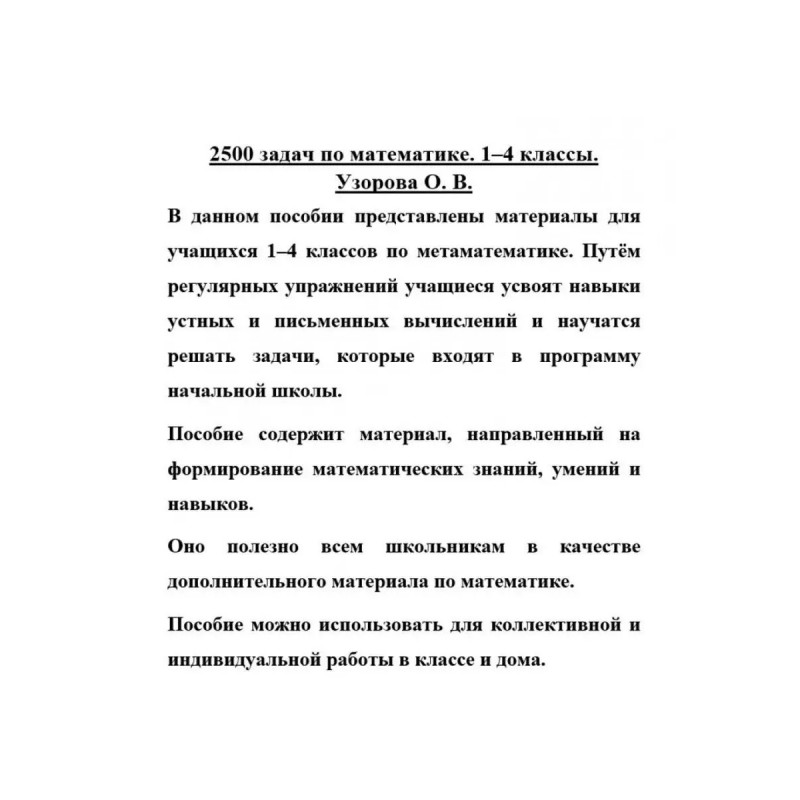 2500 задач по математике. 1-4 классы. Узорова О. В. В данном пособии представлены материалы для учащихся 1-4 классов по математике. Путём регулярных упражнений учащиеся усвоят навыки устных и письменных вычислений и научатся решать задачи, которые входят в программу начальной школы... Пособие содержит материал, направленный на формирование математических знаний, умений и навыков... Оно полезно всем школьникам в качестве дополнительного материала по математике. Пособие можно использовать для коллективной и индивидуальной работы в классе или дома.