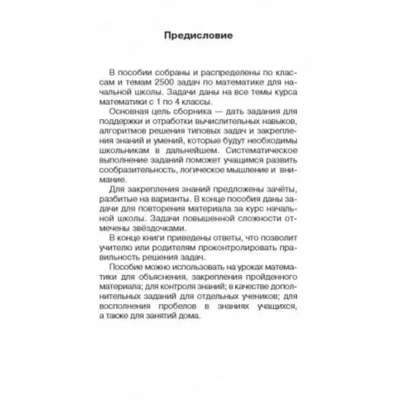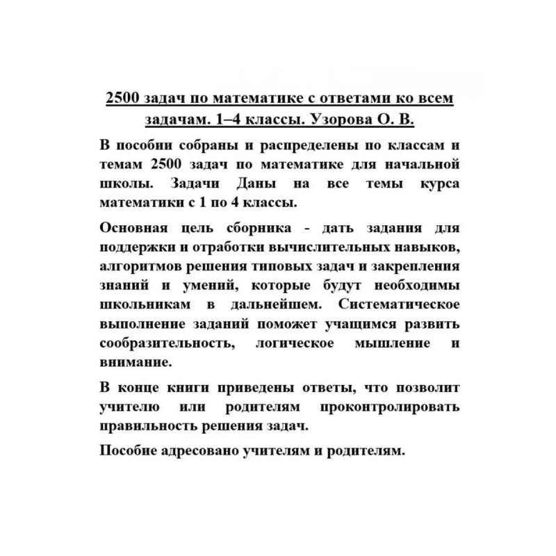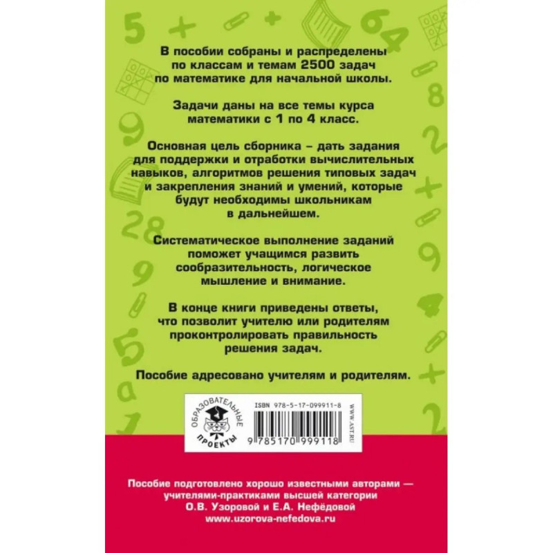 ISBN 9785-17099-9118. 2500 задач по математике с ответами ко всем задачам. 1-4 классы. Узорова О. В. В данном пособии представлен материал для учащихся 1-4 классов по математике. Путем регулярных упражнений учащиеся усвоят навыки устных и письменных вычислений и научатся решать задачи, которые входят в программу начальной школы. Пособие содержит материал, направленный на формирование математических знаний, умений и навыков. Оно полезно всем школьникам в качестве дополнительного материала по математике.. В конце книги приведены ответы, что позволит учителю или родителям проконтролировать правильность решения задач... Пособие можно использовать для коллективной и индивидуальной работы в классе или дома.