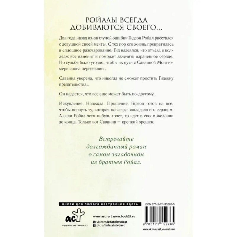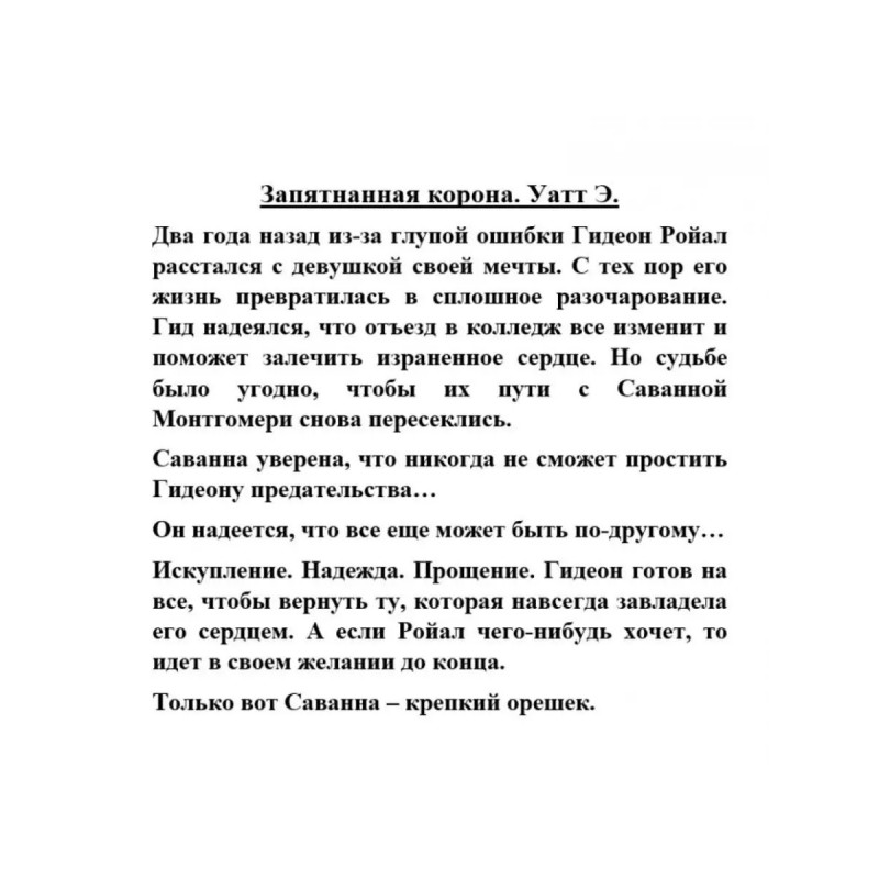 ISBN 9785-17115-2765. Запятнанная корона. Уатт Э. Запятнанная корона. Уатт Э. Два года назад из-за глупой ошибки Гидеон Ройал расстался с девушкой своей мечты. С тех пор его жизнь превратилась в сплошное разочарование. Гид надеялся, что отъезд в колледж все изменит и поможет залечить израненное сердце. Но судьбе было угодно, чтобы их пути с Саванной Монтгомери снова пересеклись. Саванна уверена, что никогда не сможет простить Гидеону предательстваОн надеется, что все еще может быть по-другомуИскупление. Надежда. Прощение. Гидеон готов на все,чтобы вернуть ту, которая навсегда завладела его сердцем. А если Ройал чего-нибудь хочет, то идет в своем желании до конца. Только вот Саванна крепкий орешек.