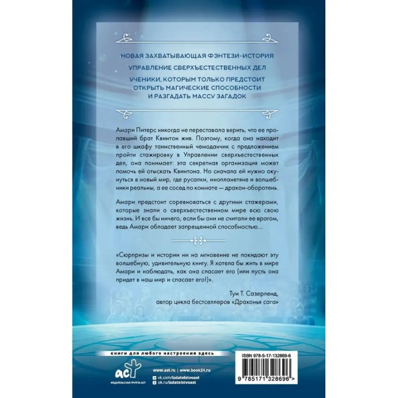 ISBN 9785-17132-8696. Амари и Братство ночи. Амари Питерс никогда не переставала верить, что ее пропавший брат Квинтон жив. Поэтому, когда она находит в его шкафу таинственный чемоданчик с предложением пройти стажировку в Управлении сверхъестественных дел, она понимает: эта секретная организация может помочь ей отыскать Квинтона. Но сначала ей нужно окунуться в новый мир, где русалки, инопланетяне и волшебники реальны, а ее сосед по комнате дракон-оборотень. Амари предстоит соревноваться с другими стажерами, которые знали о сверхъестественном мире всю свою жизнь. И все бы ничего, если бы они не считали ее врагом, ведь Амари обладает запрещенной способностью