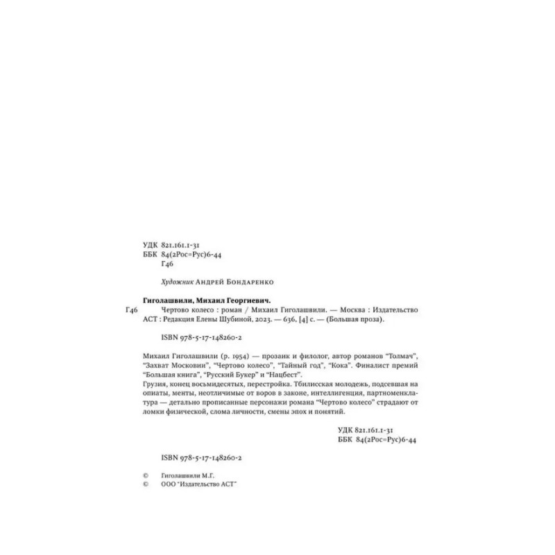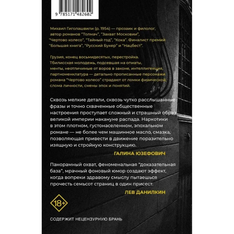 Чертово колесо. Гиголашвили М. Грузия, конец восьмидесятых, перестройка. Тбилисская молодежь, подсевшая на опиаты, менты, неотличимые от воров в законе, интеллигенция, партноменклатура - детально прописанные персонажи романа Чертово колесо страдают от ломки физической, слома личности, смены эпох и понятий.