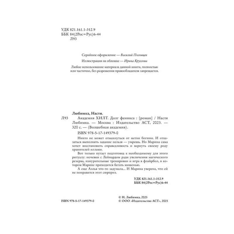 Академия ХИЛТ. Долг феникса. Любимка Н. Никто не может отмахнуться от метки богини. И отказаться выполнять задание нельзя умрешь. Но Марина сама хочет восстановить справедливость и вернуть своему роду хранителей иллами. Вот только пугает подготовка к необходимому для этого ритуалу: ночевки с Лейнардом ради увеличения магического резерва, изнурительные тренировки и игра в флайрбол, в котором Марине приходится бегать мишенью. А еще Аэлья что-то задумала... И Марина уверена, что ей не понравится этот сюрприз