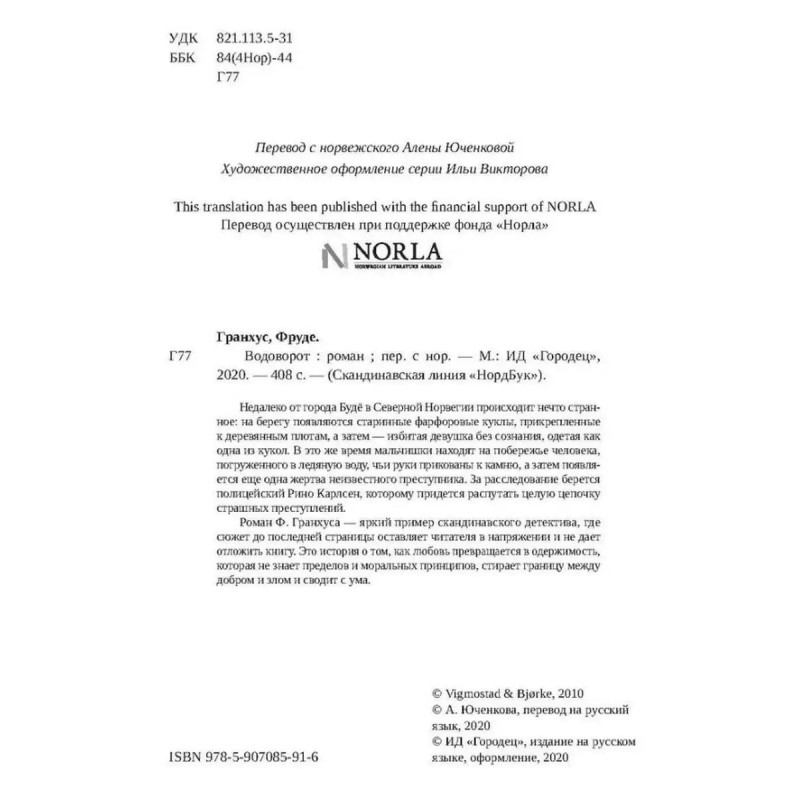 Водоворот. Фруде Гранхус. Недалеко от города Будё в Северной Норвегии происходит нечто странное: на берегу появляются старинные фарфоровые куклы, прикрепленные к деревянным плотам, а затем избитая девушка без сознания, одетая как одна из кукол.В это же время мальчишки находят на побережье человека, погруженного в ледяную воду, чьи руки прикованы к камню, а затем появляется еще одна жертва неизвестного преступника. За расследование берется полицейский Рино Карлсен, которому придется распутать целую цепочку страшных преступлений.Роман Ф. Гранхуса яркий пример скандинавского детектива, где сюжет до последней страницы оставляет читателя в напряжении и не дает отложить книгу. Это история о том, как любовь превращается в одержимость, которая не знает пределов и моральных принципов, стирает границу между добром и злом и сводит с ума.