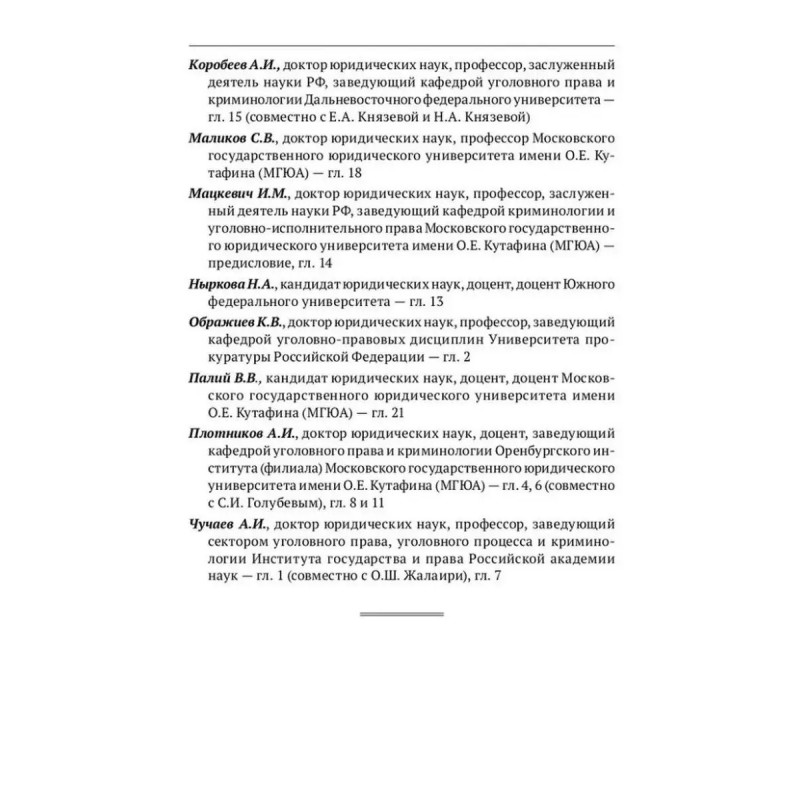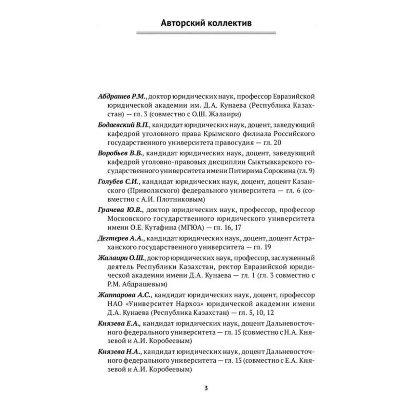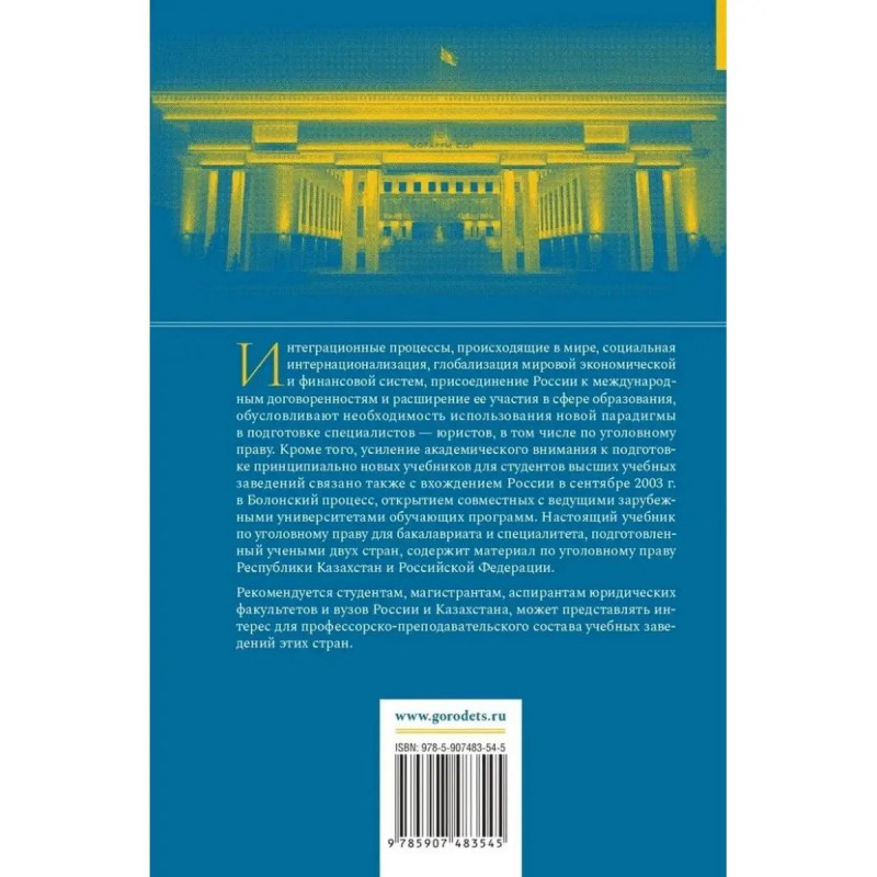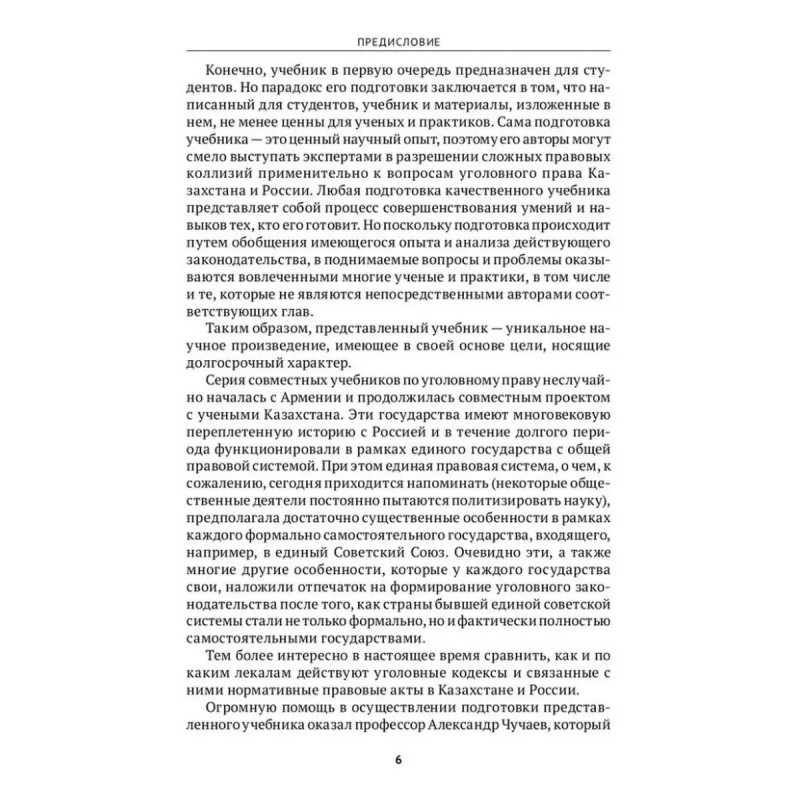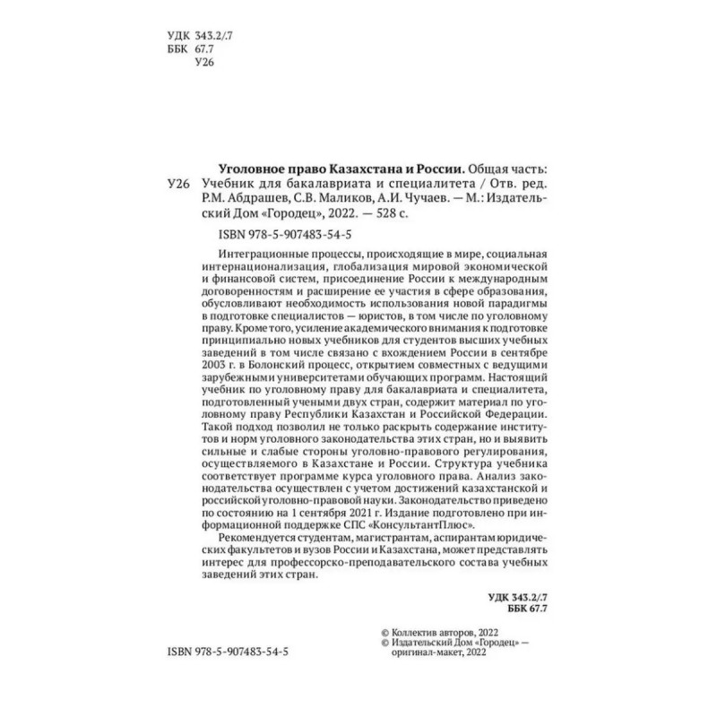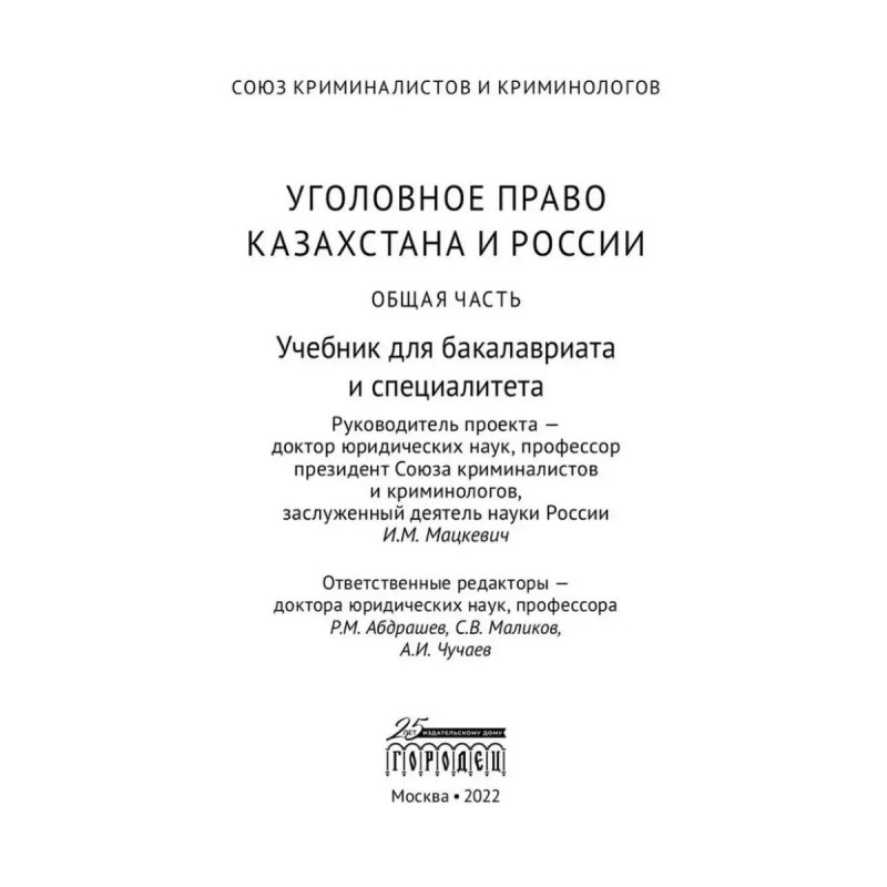 Уголовное право Казахстана и России. Общая часть. Мацкевич И. М. Руководитель проекта доктор юридических наук, профессор президент Союза криминалистов и криминологов, заслуженный деятель науки России И.М. Мацкевич.Ответственные редакторы доктора юридических наук, профессора Р.М. Абдрашев, С.В. Маликов, А.И. Чучаев.Интеграционные процессы, происходящие в мире, социальная интернационализация, глобализация мировой экономической и финансовой систем, присоединение России к международным договоренностям и расширение ее участия в сфере образования, обусловливают необходимость использования новой парадигмы в подготовке специалистов юристов, в том числе по уголовному праву. Кроме того, усиление академического внимания к подготовке принципиально новых учебников для студентов высших учебных заведений в том числе связано с вхождением России в сентябре 2003г. в Болонский процесс, открытием совместных с ведущими зарубежными университетами обучающих программ.Настоящий учебник по уголовному праву для бакалавриата и специалитета, подготовленный учеными двух стран, содержит материал по уголовному праву Республики Казахстан и Российской Федерации. Такой подход позволил не только раскрыть содержание институтов и норм уголовного законодательства этих стран, но и выявить сильные и слабые стороны уголовно-правового регулирования, осуществляемого в Казахстане и России.Структура учебника соответствует программе курса уголовного права. Анализ законодательства осуществлен с учетом достижений казахстанской и российской уголовно-правовой науки. Законодательство приведено по состоянию на 1 сентября 2021г. Издание подготовлено при информационной поддержке СПС "КонсультантПлюс".