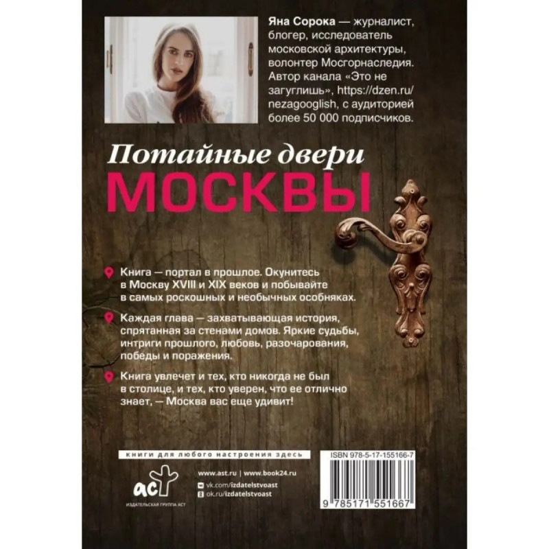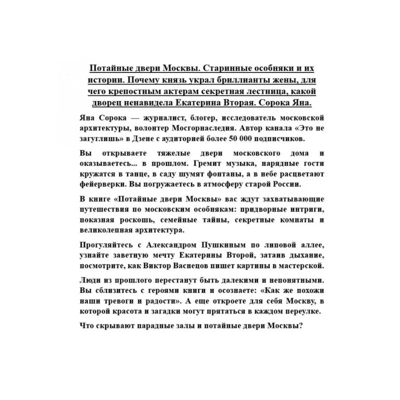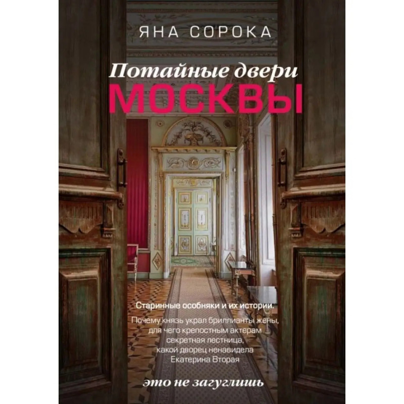 Потайные двери Москвы. Старинные особняки и их истории. Почему князь украл бриллианты жены, для чего крепостным актерам секретная лестница, какой дворец ненавидела Екатерина Вторая. Сорока Яна. Яна Сорока журналист, блогер, исследователь московской архитектуры, волонтер Мосгорнаследия. Автор канала "Это не загуглишь" в Дзене с аудиторией более 50 000 подписчиков. Вы открываете тяжелые двери московского дома и оказываетесь... в прошлом. Гремит музыка, нарядные гости кружатся в танце, в саду шумят фонтаны, а в небе расцветают фейерверки. Вы погружаетесь в атмосферу старой России. В книге "Потайные двери Москвы" вас ждут захватывающие путешествия по московским особнякам: придворные интриги, показная роскошь, семейные тайны, секретные комнаты и великолепная архитектура. Прогуляйтесь с Александром Пушкиным по липовой аллее, узнайте заветную мечту Екатерины Второй, затаив дыхание, посмотрите, как Виктор Васнецов пишет картины в мастерской. Люди из прошлого перестанут быть далекими и непонятными. Вы сблизитесь с героями книги и осознаете: "Как же похожи наши тревоги и радости". А еще откроете для себя Москву, в которой красота и загадки могут прятаться в каждом переулке. Что скрывают парадные залы и потайные двери Москвы?