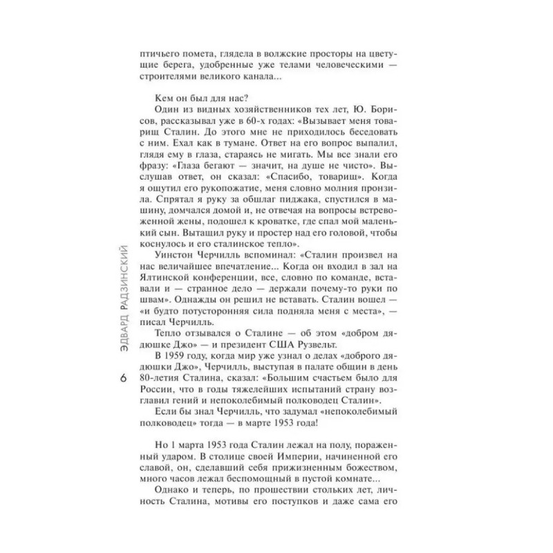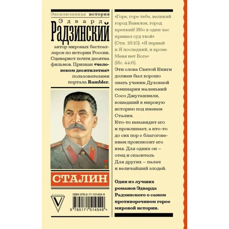 Сталин. Радзинский Э. С. Эдвард Радзинский писатель, драматург, историк, сценарист, а также создатель телевизионных передач и документальных фильмов. Его книги о Николае II, Распутине, Александре II и Сталине вышли в крупнейших мировых издательствах, переведены на 40 языков и стали бестселлерами по всему миру. Книга "Сталин" всегда будет уникальным культурным артефактом, чья подлинность и авторитетность не поддается сомнению."Горе, горе тебе, великий город Вавилон, город крепкий! Ибо в один час пришел суд твой" (ОТК. 18: 10). "Я первый и Я последний, и кроме Меня нет Бога" (Ис. 44: 6). Эти слова Святой Книги должен был хорошо знать ученик Духовной семинарии маленький Сосо Джугашвили, вошедший в мировую историю под именем Сталина. Иосиф Сталин мрачная фигура советского прошлого. Кто-то ненавидит его и проклинает, а кто-то до сих пор с благоговением произносит его имя. Для одних он "отец" и "спаситель". Для других "палач" и "величайший злодей". Один из лучших романов Эдварда Радзинского о самом противоречивом герое мировой истории. Для кого книга:Для тех, кто любит точные исторические фактыДля тех, кто увлекается исторической публицистикойДля тех, кто интересуется историей нашего Отечества.
