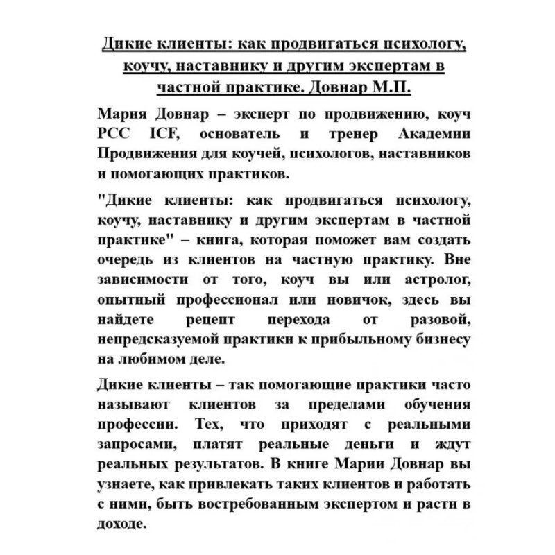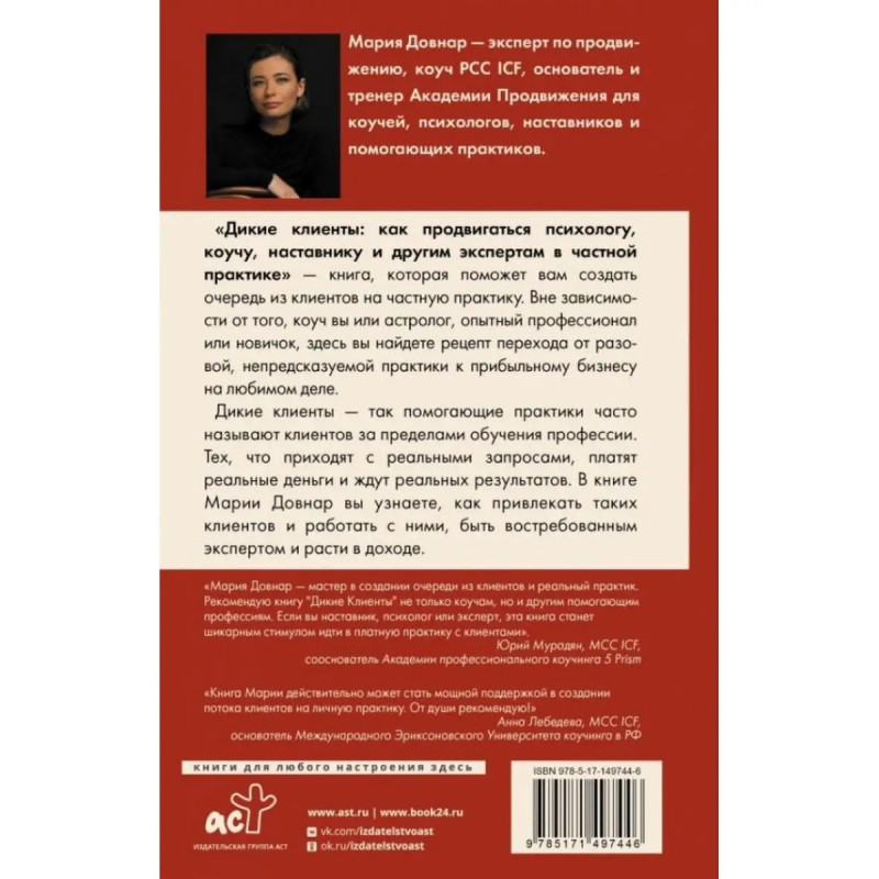 Дикие клиенты: как продвигаться психологу, коучу, наставнику и другим экспертам в частной практике. Довнар М. П. Мария Довнар эксперт по продвижению, коуч PCC ICF, основатель и тренер Академии Продвижения для коучей, психологов, наставников и помогающих практиков."Дикие клиенты: как продвигаться психологу, коучу, наставнику и другим экспертам в частной практике" книга, которая поможет вам создать очередь из клиентов на частную практику. Вне зависимости от того, коуч вы или астролог, опытный профессионал или новичок, здесь вы найдете рецепт перехода от разовой, непредсказуемой практики к прибыльному бизнесу на любимом деле. Дикие клиенты так помогающие практики часто называют клиентов за пределами обучения профессии. Тех, что приходят с реальными запросами, платят реальные деньги и ждут реальных результатов. В книге Марии Довнар вы узнаете, как привлекать таких клиентов и работать с ними, быть востребованным экспертом и расти в доходе.