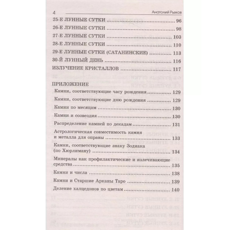 Лунные дни и камни. Рыжов А. Н. Данная книга представляет собой очередной цикл лекций известного российского астролога Анатолия Николаевича Рыжова, посвященный описанию лунных дней и их космической связи с минералами. Приведены подробные рекомендации о ношении и использовании минералов в каждый из 30 лунных дней, применительно к его энергетике. . Как сказал сам А. Н. Рыжов, "в первых лекциях я дам дни и камни, а напоследок я дам информацию, как их чистить, что с ними делать, с этими камнями: лечить, мочить, дробить, на стенку вешать, на каком пальце, на каком месте носить; зачем, когда, куда...". . В качестве приложения в книге размещены таблицы астрологической совместимости камней с металлами, соответствия камней со знаками Зодиака, лечебных свойств минералов.