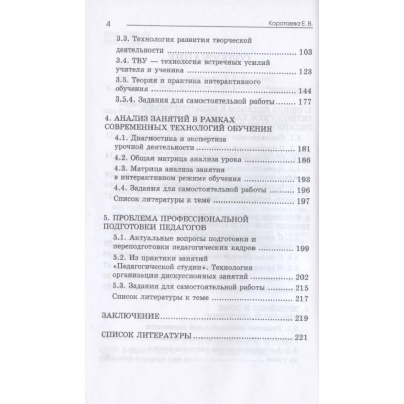 Педагогические технологии. Коротаева Е. В. Данное учебное пособие представляет собой авторское обобщение активно разрабатываемых в педагогике вопросов, касающихся педагогических технологий. В материалах отражены теоретические подходы и практические наработки, связанные с освоением педтехнологий в образовательном процессе. Даны некоторые рекомендации по внедрению как известных в педагогике направлений, так и достаточно новых подходов (технология встречных усилий учителя и учащегося, интерактивная организация учебного процесса). Пособие предназначено для широкого круга читателей: студентов педвузов и колледжей, практикующих учителей и педагогов, обучающихся в магистратуре, аспирантуре по педагогическим специальностям, слушателей курсов повышения квалификации в образовательной сфере.