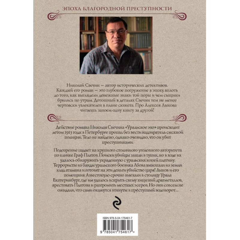 Уральское эхо. Свечин Н. Захватывающий исторический детектив от победителя премии Русский детектив Николая Свечина. Действие романа Николая Свечина Уральское эхо происходит летом 1913 года: в Петербурге пропал без вести надзиратель сыскной полиции. Тело не найдено, однако очевидно, что он убит преступниками. Подозрение падает на крупного столичного уголовного авторитета по кличке Граф Платов. Поиски убийцы зашли в тупик, но в ходе них удалось обнаружить украденную с уральских копей платину. Террористы из банды уральского боевика Лбова выкопали из земли клад атамана и готовят на эти деньги убийство царя! Лыков и его помощник Азвестопуло срочно выехали в столицу Урала Екатеринбург, где им удалось вскрыть схему хищений драгметаллов, арестовать Платова и разгромить местных эсеров. Но они совсем не ожидали, что сами окажутся втянуты в преступный водоворот