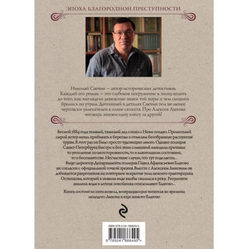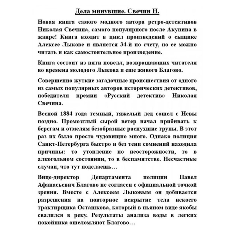 Дела минувшие. Свечин Н. Новая книга самого модного автора ретро-детективов Николая Свечина, самого популярного после Акунина в жанре! Книга входит в цикл произведений о сыщике Алексее Лыкове и является 34-й по счету, но ее можно читать и как самостоятельное произведение. Книга состоит из пяти новелл, возвращающих читателя во времена молодого Лыкова и еще живого Благово. Совершенно жуткие загадочные происшествия от одного из самых популярных авторов исторических детективов, победителя премии "Русский детектив" Николая Свечина. Весной 1884 года темный, тяжелый лед сошел с Невы поздно. Промозглый сырой ветер начал прибивать к берегам и отмелям безобразные распухшие трупы. В этот раз их было просто чудовищно много. Однако полиция Санкт-Петербурга быстро и без тени сомнений находила причины: то утопление по неосторожности, то в алкогольном состоянии, то в беспамятстве. Несчастные случаи, что тут поделаешьВице-директор Департамента полиции Павел Афанасьевич Благово не согласен с официальной точкой зрения. Вместе с Алексеем Лыковым он добивается разрешения на повторное вскрытие тела некоего трактирщика Осташкова, который в пьяном виде якобы свалился в реку. Результаты анализа воды в легких покойника ошеломляют Благово