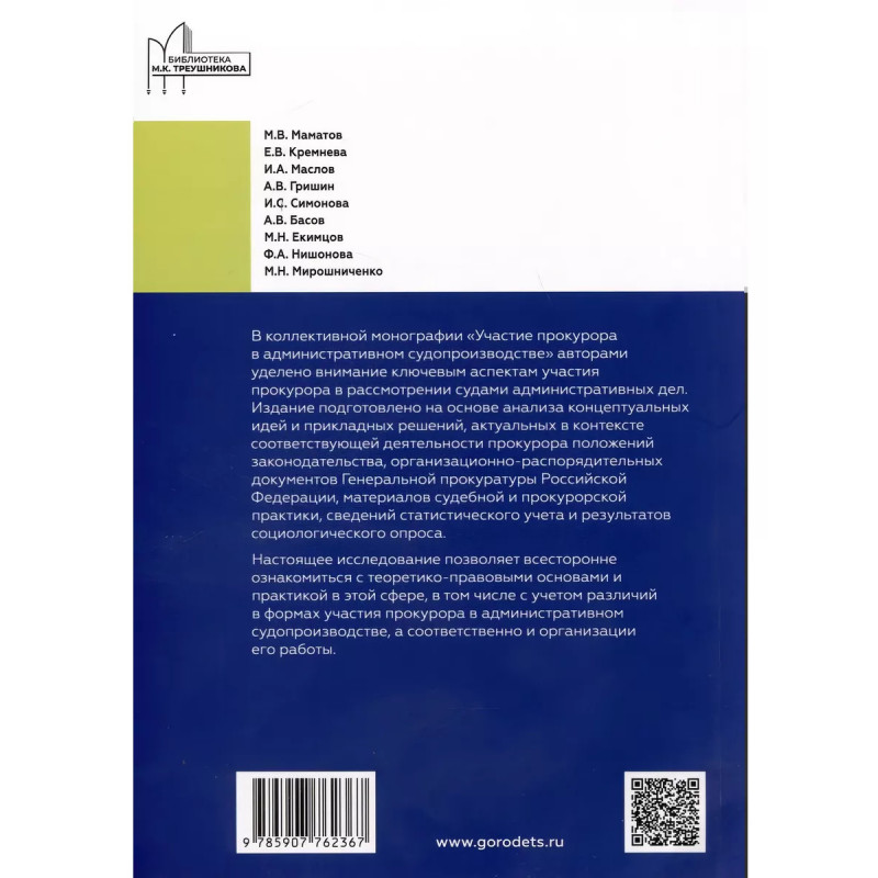 Участие прокурора в административном судопроизводстве. В коллективной монографии исследуются теоретико-правовые основы современного статуса прокурора в административном судопроизводстве, освещаются вопросы организации его работы (в том числе при доказывании), особенности участия прокуроров в рассмотрении судами отдельных категорий административных дел, а также при пересмотре судебных актов по административным делам. Не остались без внимания и ключевые аспекты защиты интересов прокуратуры в административном судопроизводстве.Для широкого круга читателей, в том числе практических и научных работников прокуратуры, а также для использования в учебном процессе при подготовке кадров для органов прокуратуры.