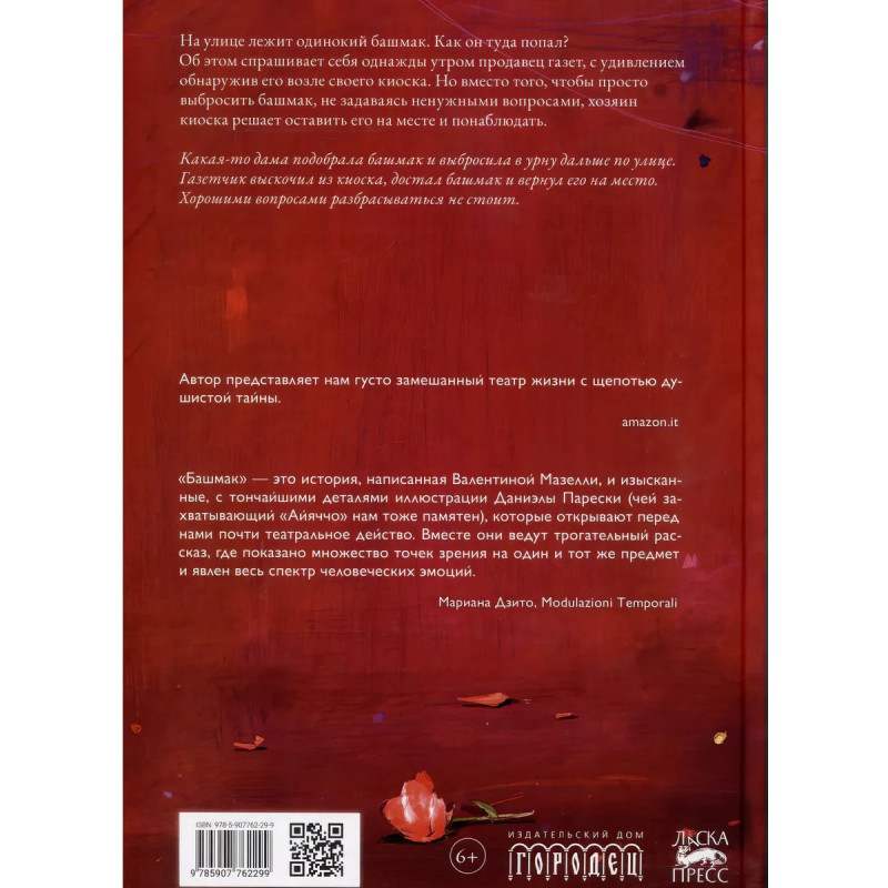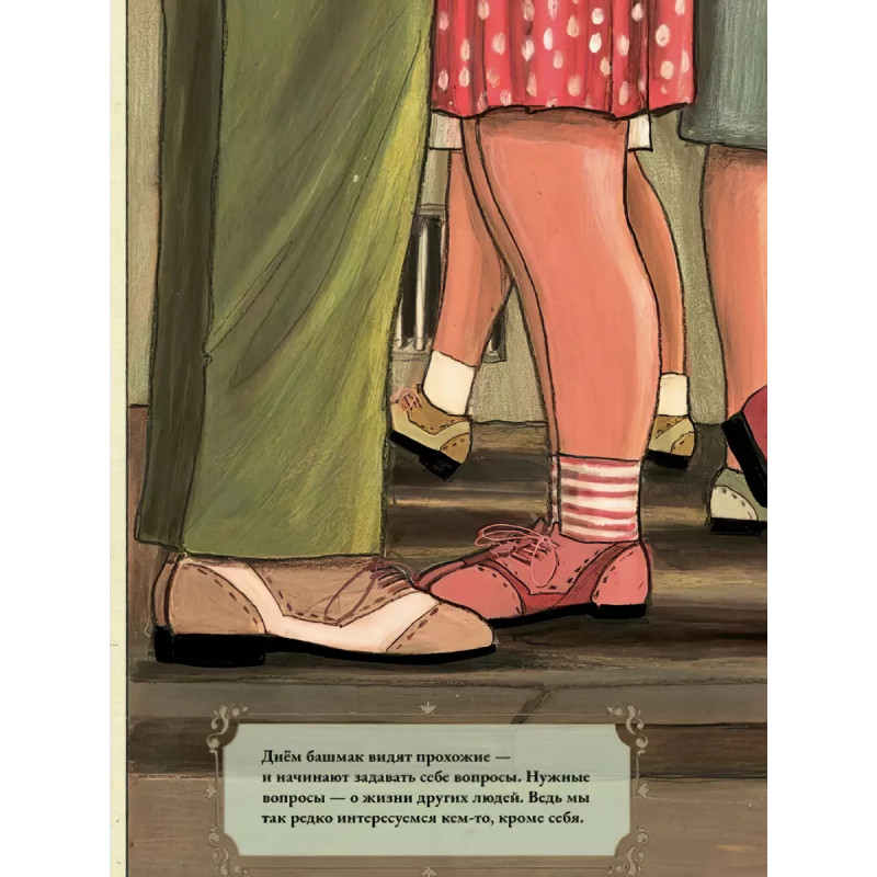Башмак. Мазелли В. На улице лежит башмак. Причём один. Его явно не выкинули. А как же он там оказался?Продавец газет, господин на костылях и маленькая девочка отвечают на этот вопрос по-разному. А деловая женщина, влюблённый юноша, уличный артист и мышонок просто используют его в своих целях.Башмак это придуманная неаполитанской актрисой и генуэзской художницей история о том, как по-разному люди воспринимают этот мир. И о том, как важно задавать себе хорошие вопросы.