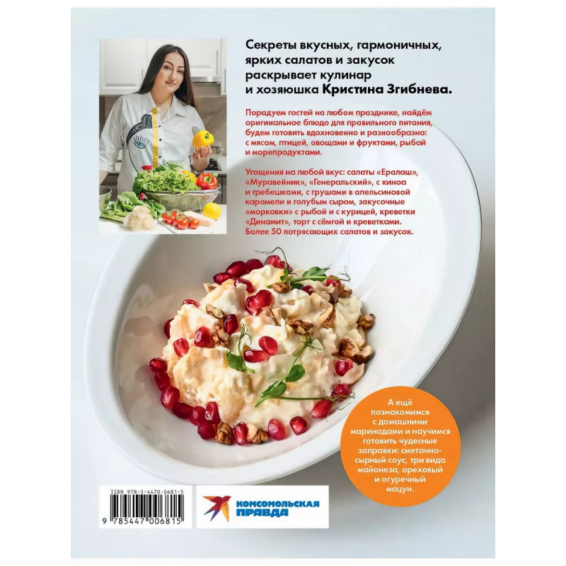 Салатный бум. Домашние и современные рецепты для праздников и будней. Згибнева К. Секреты вкусных, гармоничных, ярких салатов и закусок раскрывает кулинар и хозяюшка Кристина Згибнева. Порадуем гостей на любом празднике, найдем оригинальные блюда для правильного питания, для торжественных случаев и закусок "на скорую руку", будем готовить вдохновенно и разнообразно: с мясом, птицей, овощами и фруктами, рыбой и морепродуктами. Угощения на любой вкус: салаты "Ералаш", "Муравейник", "Генеральский", с киноа и гребешками, с грушами в апельсиновой карамели и голубым сыром, закусочные "морковки" с рыбой и с курицей, креветки "Динамит", торт с семгой и креветками. Более 50 потрясающих салатов и закусок. А еще познакомимся с домашними маринадами и научимся готовить чудесные заправки: сметанно-сырный соус, три вида майонеза, ореховый и огуречный мацун. Салатов много не бывает!