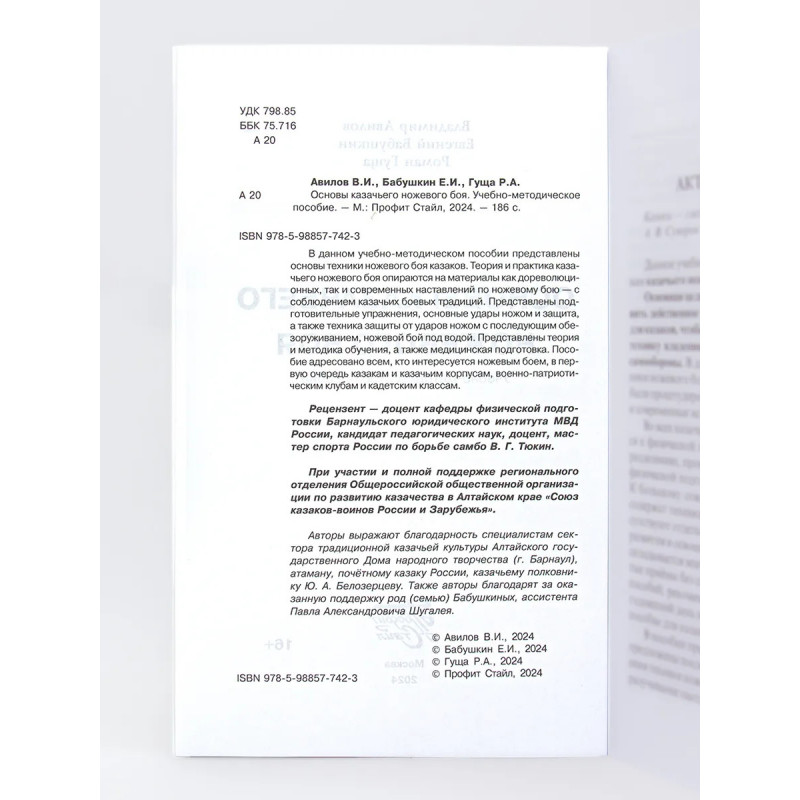Основы казачьего ножевого боя. Авилов В. И, Бабушкин Е. И. В данном учебно-методическом пособии представлены основы техники ножевого боя казаков. Теория и практика казачьего ножевого боя опираются на материалы как дореволюционных, так и современных наставлений по ножевому бою с соблюдением казачьих боевых традиций. Представлены подготовительные упражнения, основные удары ножом и защита, а также техника защиты от ударов ножом с последующим обезоруживанием, ножевой бой под водой. Представлены теория и методика обучения, а также медицинская подготовка. Пособие адресовано всем, кто интересуется ножевым боем, в первую очередь казакам и казачьим корпусам, военно-патриотическим клубам и кадетским классам.