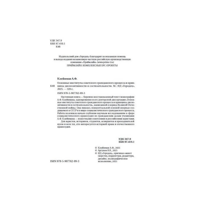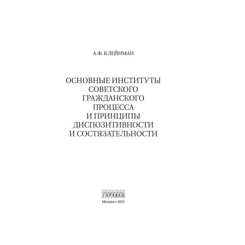 Настоящая книга бережно восстановленный текст монографии А. Ф. Клейнмана, одновременно и его докторской диссертации "Основные институты советского гражданского процесса и принципы диспозитивности и состязательности", написанной в период Великой Отечественной войны. Она явилась концептуальной основой впервые создаваемого в СССР и в мире социалистического гражданского процесса. Работа положила начало глубоким научным исследованиям в сфере социалистического правосудия по гражданским делам учениками А. Ф. Клейнмана известными советскими и российскими юристами. Для юристов, историков, студентов, аспирантов и преподавателей вузов и всех тех, кто интересуется историей права и отечественного правосудия.