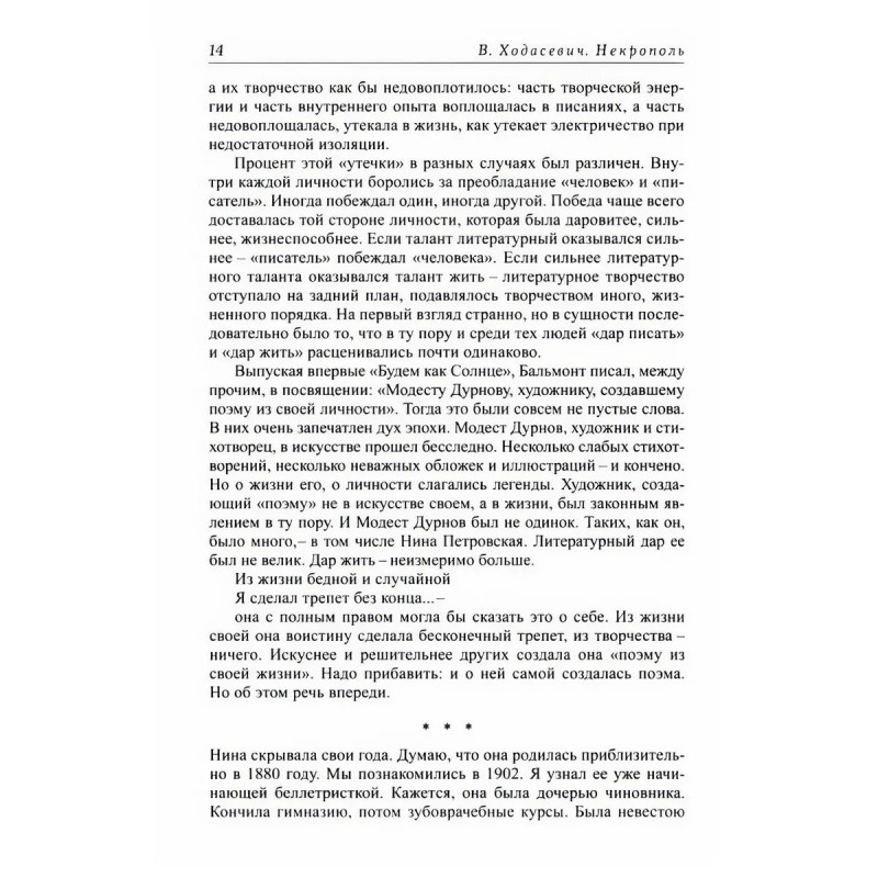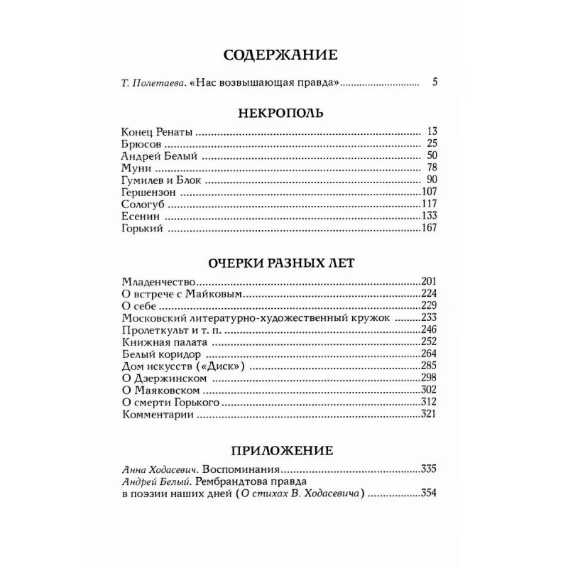 Владислав Фелицианович Ходасевич (18861939), выдающийся поэт Серебряного века, критик и историк литературы, оставил нам замечательные воспоминания, на страницах которых живут его друзья и знакомые А. Блок, А. Белый, В. Брюсов, М. Горький, Н. Гумилев, С. Есенин, В. Маяковский, другие видные литераторы той эпохи, государственные деятели послереволюционной России Ф. Дзержинский, А. Луначарский, Л. Каменев, Г. Зиновьев. Язык Ходасевича точен и выразителен, а оценки честны и порой весьма нелицеприятны. В книгу вошли сборник Некрополь, составленный автором в 1939 году, очерки разных лет, печатавшиеся в российских и зарубежных изданиях, а также воспоминания его жены Анны Ходасевич и статья Андрея Белого о поэзии Ходасевича.