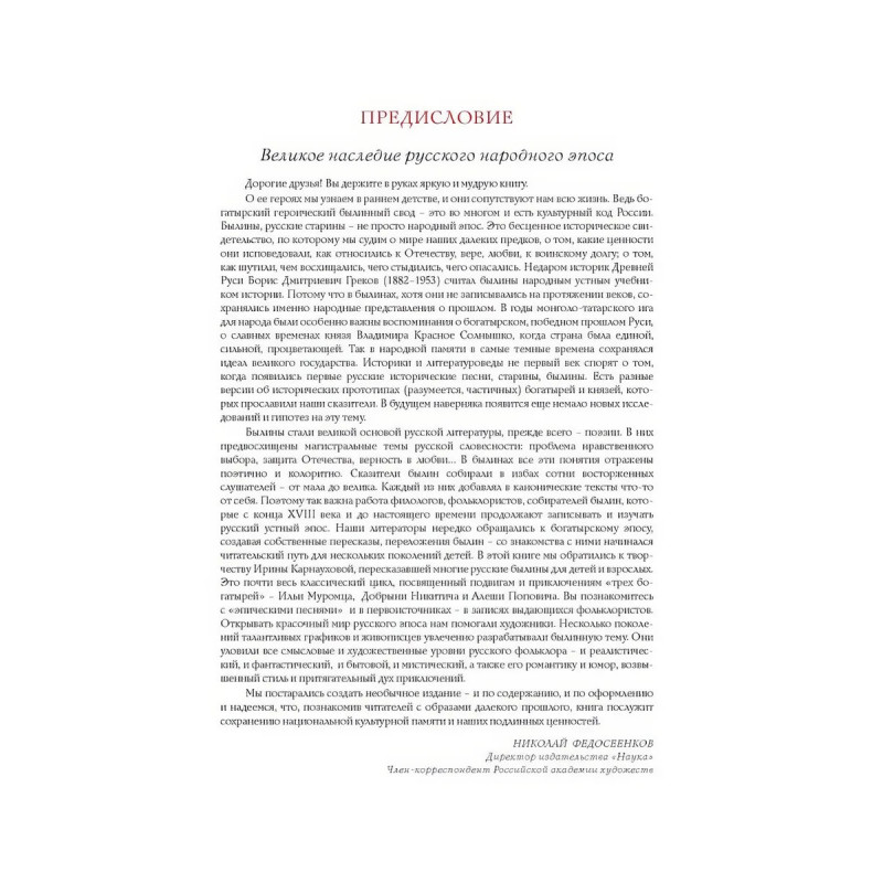 Книги Издательства Наука Былины в иллюстрациях русских художников Книга представляет собой иллюстрированное издание былин народных эпических песен о русских богатырях и включает как их переложения в прозе, выполненные известным фольклористом И. Карнауховой и впервые опубликованные в послевоенном 1949 г. с иллюстрациями Н. Кочергина, ставшие популярными и многократно переиздававшиеся впоследствии, так и оригинальные песенные тексты, публикующиеся по фундаментальному продолжающемуся изданию Свод русского фольклора, серия Былины, подготовленному по архивным материалам Институтом русской литературы (Пушкинский Дом) Российской академии наук. Былинный эпос издавна вдохновлял художников на создание эпических полотен и отдельных образов могучих русских богатырей, ведь в нем содержится огромный пласт древних верований, мифологических образов, а также исторических личностей и событий, описание древнерусского повседневного быта и социального устройства. Именно в русском эпосе с его сильным и искренним национальным чувством формировались на протяжении веков представления о добре и зле, о правде и силе, о чести и долге, выстраивая в слушателях и читателях нравственные ориентиры. Перед читателями откроется целый мир былинных героев, их жизни, подвигов и приключений: древний богатырь-великан Святогор, богатырь-чародей Вольга, богатырь-пахарь Микула Селянинович, любимые в народе Добрыня Никитич, Алеша Попович и Илья Муромец, а еще Данило Игнатьевич и его сын юный богатырь Данило, народный певец и гусляр, купец новгородский Садко, Михайло Козаринов, Ставр Годинович и его жена, хитроумная Василиса Микулишна, каждый со своей историей и характером. А более ста уникальных иллюстраций таких художников, как В. Васнецов, М. Врубель, А. Рябушкин, Н. Рерих, И. Билибин и Н. Воробьев, обращавшихся в своем творчестве к былинам, дополнят и оживят былинные сюжеты и образы. В книгу также вошли статьи о былинах в русском искусстве и о поэтике былин, биографии художников и Словарь устаревших и...