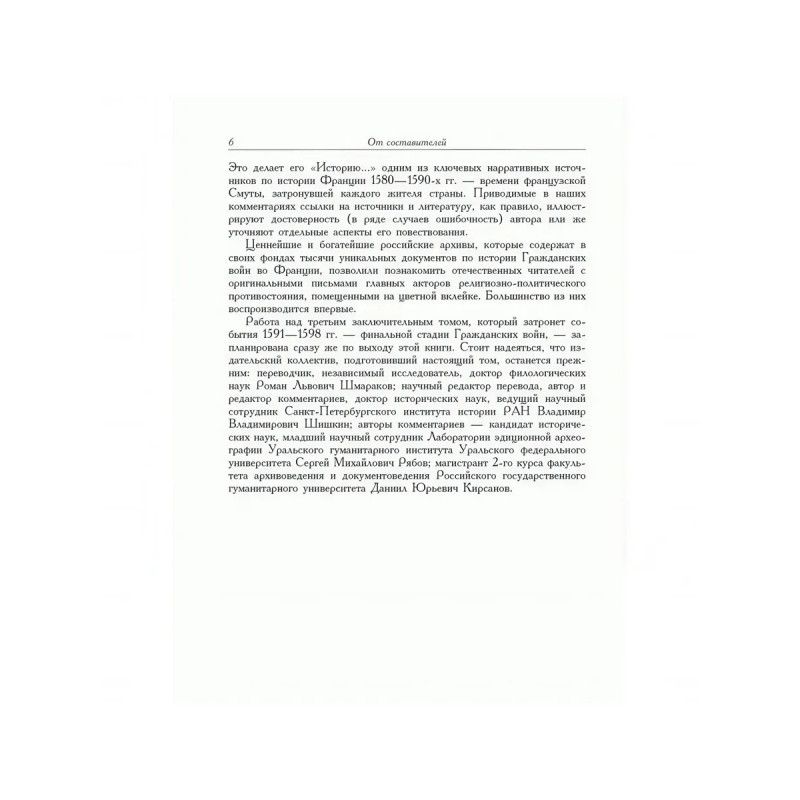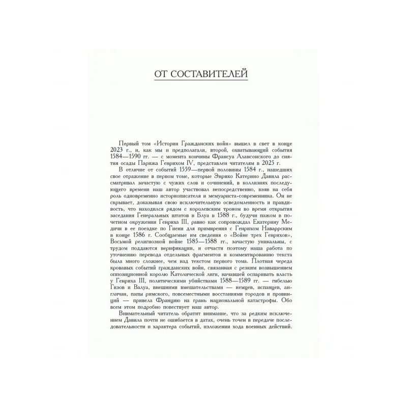 "История Гражданских войн во Франции" Энрико Катерино Давилы произведение итальянского военно-политического деятеля, в молодости служившего при дворе королей Франции из династии Валуа и ставшего свидетелем, а затем и участником масштабного конфликта между католиками и протестантами, который принято называть Религиозными войнами (15591598 гг.). В 1630 г., незадолго до смерти, Давила написал историю этих войн, сразу же получившую широкую известность и переведенную на несколько европейских языков. Перед читателем большое историческое сочинение, по сути, история Франции второй половины XVI столетия, история жестокой гражданской военно-политической и социальной борьбы. Впервые иностранный автор представил сорокалетний французский конфликт одновременно и как его участник, и как внешний наблюдатель и аналитик. Давила показал, что религиозная сторона войны зачастую уходила на второй план на фоне борьбы сторон за материальные интересы, социальный статус, привилегии, уступая место открытому столкновению великих семейных кланов и сведению личных счетов. Энрико Катерино пытался показать своим читателям, что, несмотря на свои ошибки и непоследовательность, короли из рода Валуа пытались сохранить мир, стараясь примирить враждующие религиозно-политические стороны. Второй том "Истории гражданских войн во Франции" охватывает напряженный период с 1584 по 1590 г., когда своего апогея достигло политическое соперничество между тремя Генрихами французским королем Генрихом III Валуа, герцогом Генрихом де Гизом и наваррским королем Генрихом Бурбоном. Давила рассказывает, как плотная череда кровавых событий гражданских войн, связанная с резким возвышением Католической лиги, начавшей оспаривать власть у Генриха III, политическими убийствами 15881589 гг., внешними вмешательствами, повсеместными восстаниями городов и провинций, привела Францию на грань национальной катастрофы. Перевод "Истории Гражданских войн во Франции" выполнил доктор филологических наук Р. Л. Шмараков, комментарии...