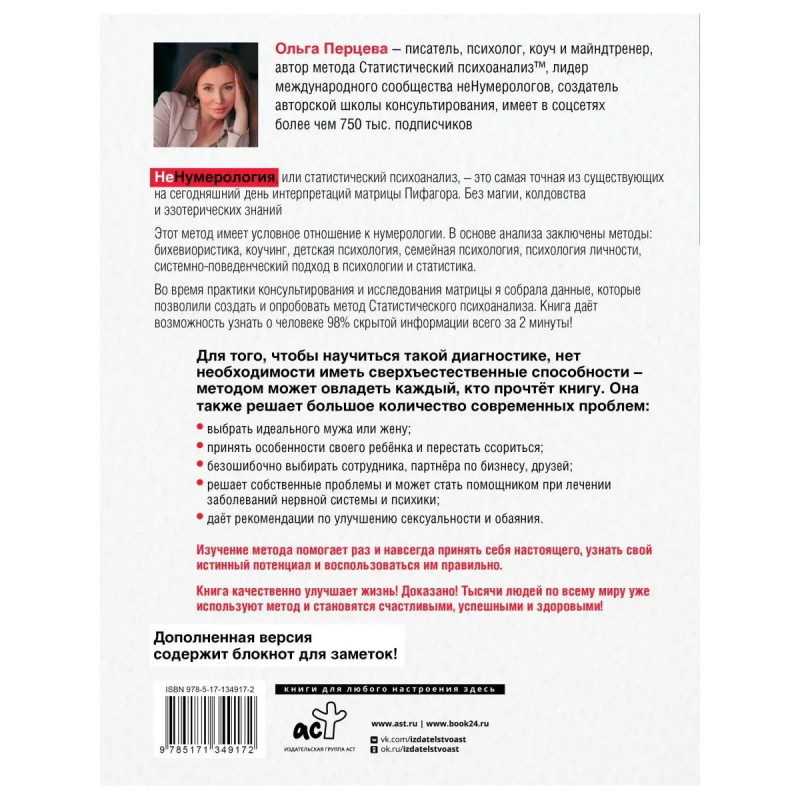 Ольга Перцева писатель, психолог, коуч и майндтренер, автор метода Статистический психоанализ, лидер международного сообщества неНумерологов, создатель авторской школы консультирования. Ведёт блог nenumerolog с более чем 75 тыс. подписчиков.