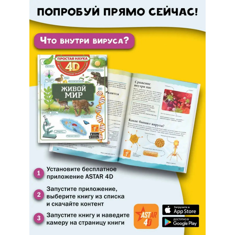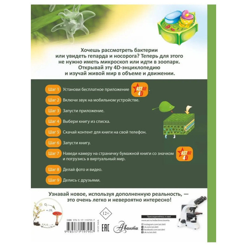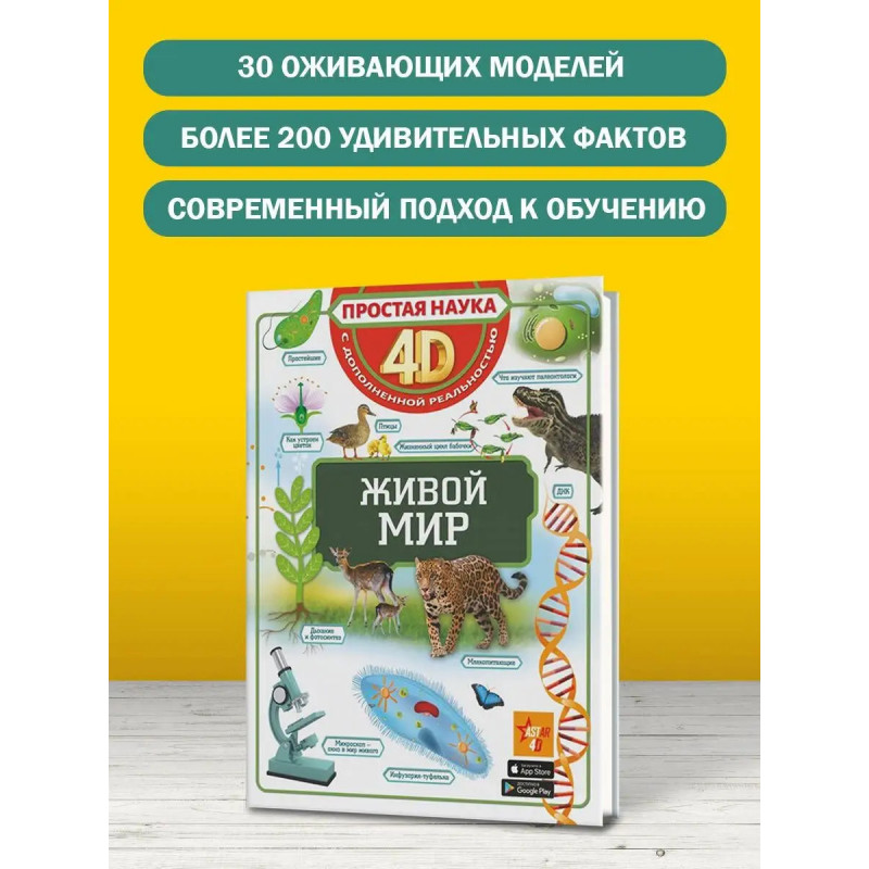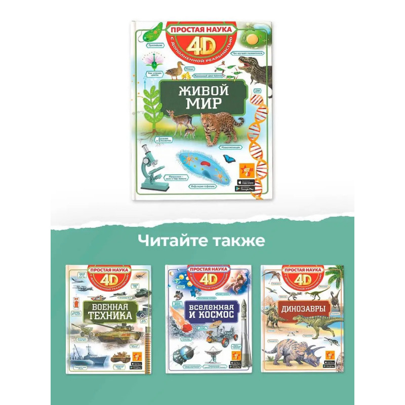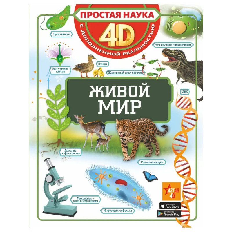 Эта книга рассказывает о живых существах, населяющих нашу планету, начиная с простейших одноклеточных и заканчивая человеком. Понаблюдать за ними теперь можно прямо на этих страницах, ведь это не обычная книга, а 4D-издание! Читай, изучай иллюстрации, рассматривай объемные движущиеся модели, слушай познавательные аудиозаписи. Элементы дополненной реальности обязательно помогут новым знаниям запомниться надолго. Изучать живой мир в 4D не только легко, но и невероятно интересно! Для среднего и старшего школьного возраста.