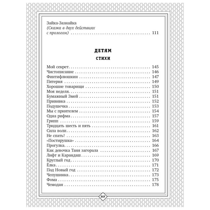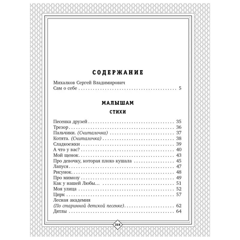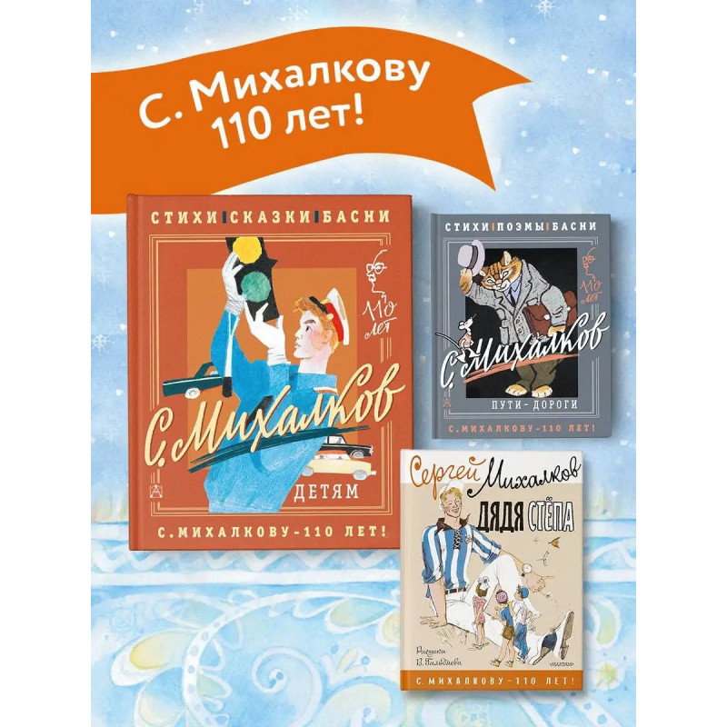 В книгу "Детям" вошли самые знаменитые произведения Сергея Михалкова для малышей и детей постарше: "А что у вас?", "Песенка друзей", "Три поросёнка", "Зайка-Зазнайка", "Дядя Стёпа", "Хочу бодаться!" и другие. Это один из самых полных сборников стихов, сказок, басен и загадок писателя-классика. В начале сборника читателей ждёт автобиография автора, которая расскажет о пути становления великого писателя и деятеля российской культуры. В книге даны цветные иллюстрации к избранных произведениям классических и современных художников. Книга издана к 11-летнему юбилею Сергея Михалкова поэта, писателя, драматурга, автора Гимна России. В серии "С. Михалкову 11 лет" выходит продолжение этой книги, но уже для взрослых "Пути-дороги", куда вошли басни, лирические стихотворения, стихи о войне и Гимн России. Для широкого круга читателей.