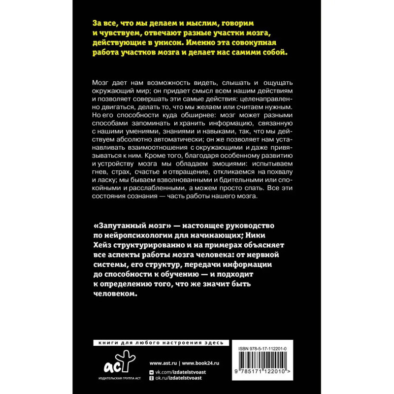 За все, что мы делаем и мыслим, говорим и чувствуем, отвечают разные участки мозга, действующие в унисон. Именно эта совокупная работа участков мозга и делает нас самими собой. Мозг дает нам возможность видеть, слышать и ощущать окружающий мир; он придает смысл всем нашим действиям и позволяет совершать эти самые действия: целенаправленно двигаться, делать то, что мы желаем или считаем нужным. Но его способности куда обширнее: мозг может разными способами запоминать и хранить информацию, связанную с нашими умениями, знаниями и навыками, так, что мы действуем абсолютно автоматически; он же позволяет нам устанавливать взаимоотношения с окружающими и даже привязываться к ним. Кроме того, благодаря особенному развитию и устройству мозга мы обладаем эмоциями: испытываем гнев, страх, счастье и отвращение, откликаемся на похвалу и ласку; мы бываем взволнованными и бдительными или спокойными и расслабленными, а можем просто спать. Все эти состояния сознания часть работы нашего мозга. "Запутанный мозг" настояще