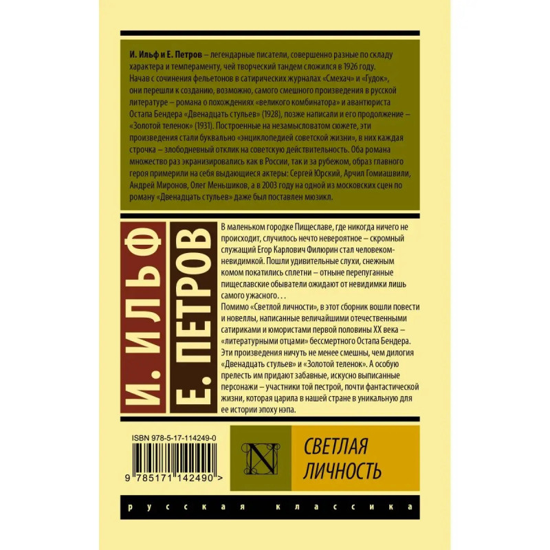 В маленьком городке Пищеслав, где никогда ничего не происходит, случилось нечто невероятное скромный служащий Егор Карлович Филюрин стал человеком-невидимкой. Пошли удивительные слухи, снежным комом покатились сплетни отныне перепуганные пищеславские обыватели ожидают от невидимки лишь самого ужасного Помимо "Светлой личности", в этот сборник вошли повести и новеллы, написанные величайшими отечественными сатириками и юмористами первой половины ХХ века "литературными отцами" бессмертного Остапа Бендера. Эти произведения ничуть не менее смешны, чем дилогия "Двенадцать стульев" и "Золотой теленок". А особую прелесть им придают забавные, искусно выписанные персонажи участники той пестрой, почти фантастической жизни, которая царила в нашей стране в уникальную для ее истории эпоху нэпа.