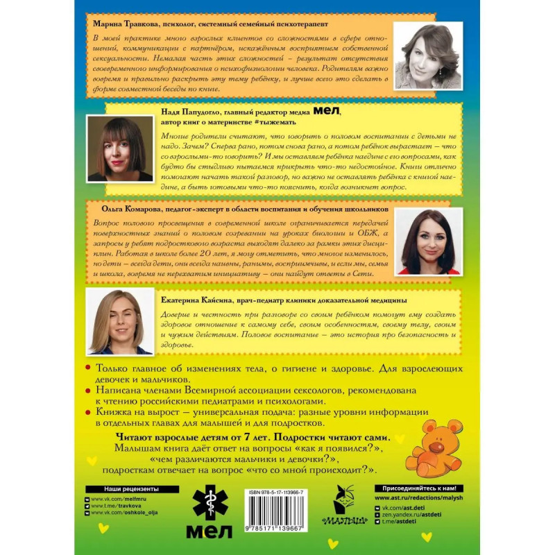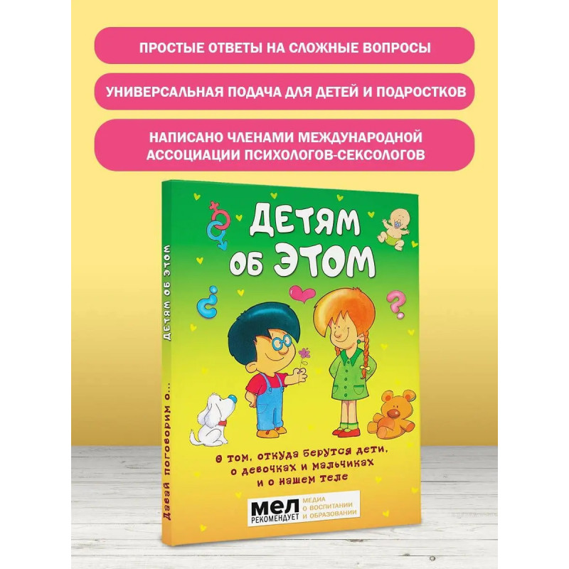 Авторы книги члены Международной ассоциации психологов-сексологов. Издание одобрено российскими педиатрами и психологами и рекомендовано к чтению педагогами. "Детям об Этом" книга ответов на первые вопросы мальчиков и девочек, вступающих в подростковый возраст: "Зачем наши тела так устроены?", "Почему у меня так неравномерно всё растёт?", "Когда начнётся менструация?", "Как наступает беременность?", "Что нормально, а что нет?" Эти и другие вопросы, связанные с взрослением тела, беспокоят абсолютно всех детей переходного возраста. И если ваш маленький подросток не задаёт вам вопросов это значит, что либо ему неловко обсуждать эту тему с вами, либо он уже нашел "ответ" в Интернете. Не приставайте с расспросами, просто дайте ребёнку книгу он сам найдет интересующую его информацию. Книга также адресована родителям малышей от 6 лет, задающих "неудобные" вопросы. Каждый раздел предваряет глава "Мамам и папам" с рекомендациями родителям по обсуждению темы с ребёнком советы, как подойти к разговору, что р