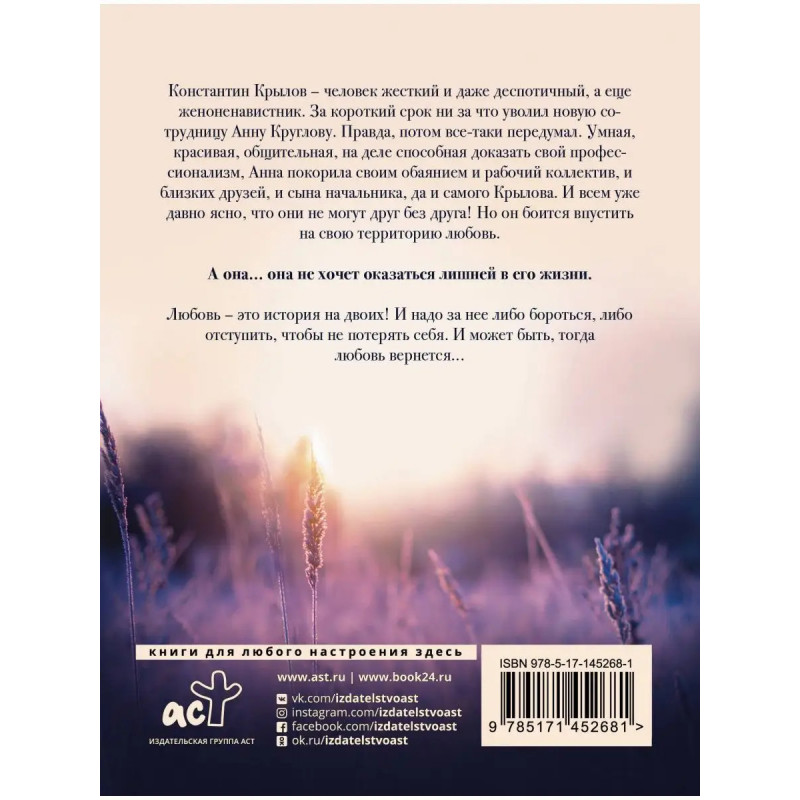 Константин Крылов - человек жесткий и даже деспотичный, а еще женоненавистник. За короткий срок ни за что уволил новую сотрудницу Анну Круглову. Правда, потом все-таки передумал. Умная, красивая, общительная, на деле способная доказать свой профессионализм, Анна покорила своим обаянием и рабочий коллектив, и близких друзей, и сына начальника, да и самого Крылова. И всем уже давно ясно, что они не могут друг без друга! Но он боится впустить на свою территорию любовь. А она... она не хочет оказаться лишней в его жизни. Любовь - это история на двоих! И надо за нее либо бороться, либо отступить, чтобы не потерять себя. И может быть, тогда любовь вернется...