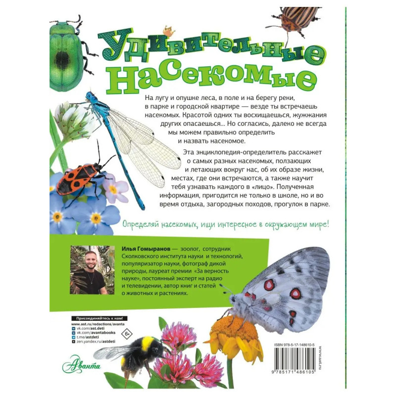 Познакомься поближе с теми, кто летает, ползает и жужжит рядом с тобой. Открой удивительный и разнообразный мир насекомых! Эта энциклопедия-определитель написана известным энтомологом, популяризатором науки Ильей Гомырановым для тех, кто хочет точно знать, кого он встречает на дачном участке, на опушке леса, лугу или на прогулках в городском парке. Ведь иногда нам только кажется, что мы знаем о них все.... Сможешь ли ты отличить муху от слепня, шершня от шмеля, поденку от водомерки? Энциклопедия-определитель поможет справиться и не с такой простой задачей. В красочной книге в емкой, но интересной форме дана разнообразная информация о насекомых нашей страны. Она пригодится на уроках в школе, для подготовки докладов и домашних заданий, а еще во время прогулок и отдыха в лесу, на реке, в горах. Изучай природу - учись определять насекомых в лесу, на лугу, в парке!