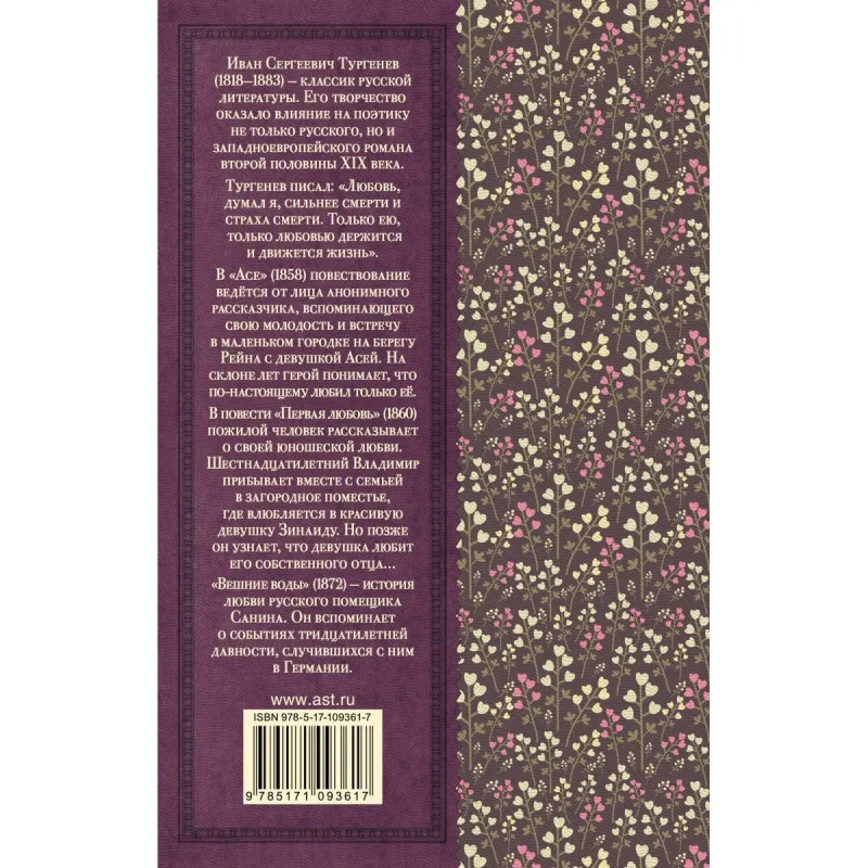 Иван Сергеевич Тургенев (1818 - 1883) - классик русской литературы. Его творчество оказало влияние на поэтику не только русского, но и западноевропейского романа второй половины ХIХ века. В книгу вошли повести Ася, Первая любовь, Вешние воды, которые изучаются в школе.
