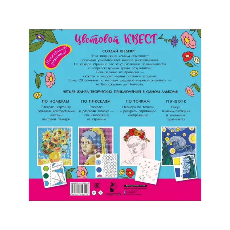 Создай свой шедевр! "Цветовой квест" серия альбомов для креативного раскрашивания. В каждой книге объединены и адаптированы для детей жанры любимых арт-квестов для взрослых: раскраски по номерам, по пикселям, по точкам. - квест по номерам. Раскрась пронумерованные детали рисунка контрастными цветами, специально подобранными художником, и увидишь неожиданный яркий результат. - квест по пикселям. Заполняй цветом части мозаики и наблюдай, как проявляется скрытая картинка. - квест по точкам. Последовательно соедини точки, чтобы разгадать сюжет картинки раскрась по собственному вкусу. Этот творческий альбом объединяет несколько увлекательных жанров раскрашивания. На каждой странице вас ждут различные задания-квесты с непредсказуемым ярким результатом. Пока задание не пройдено сюжеты и колорит картин остаются загадкой.