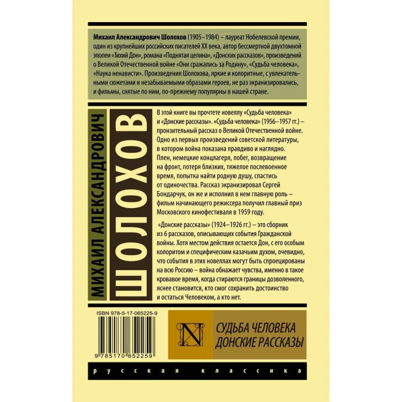 В этой книге вы прочтете новеллу "Судьба человека" и "Донские рассказы". "Судьба человека" (19561957 гг.) пронзительный рассказ о временах Великой Отечественной войны. Одно из первых произведений советской литературы, в котором война показана правдиво и наглядно. Плен, немецкие концлагеря, побег, возвращение на фронт, потеря близких, тяжелое послевоенное время, попытка найти родную душу, спастись от одиночества. Рассказ экранизировал Сергей Бондарчук, он же и исполнил в нем главную роль фильм начинающего режиссера получил главный приз Московского кинофестиваля в 1959 году. "Донские рассказы" (19241926 гг.) это сборник из шести рассказов, описывающих события Гражданской войны. Хотя местом действия остается Дон, с его особым колоритом и специфическим казачьим духом, очевидно, что события в этих новеллах могут быть спроецированы на всю Россию война обнажает чувства, именно в такое кровавое время, когда стираются границы дозволенного, яснее становится, кто смог сохранить достоинство и остаться Чел