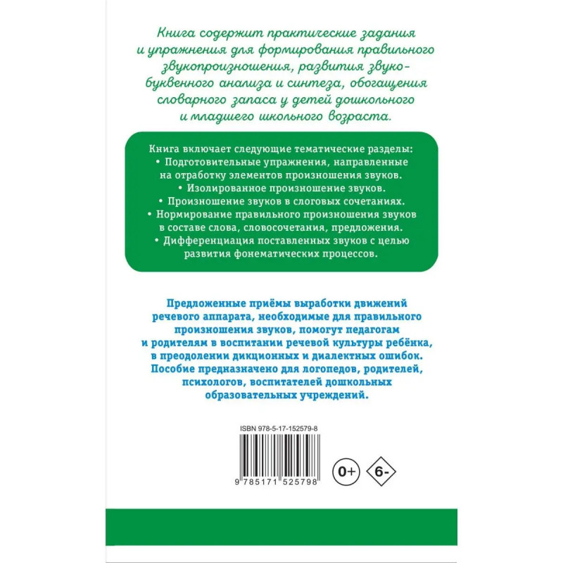 Книга содержит практические задания и упражнения для формирования правильного звукопроизношения, развития звуко-буквенного анализа и синтеза, обогащения словарного запаса у детей дошкольного и младшего школьного возраста. Книга включает тематические разделы: Подготовительные упражнения, направленные на отработку элементов произношения звуков. Изолированное произношение звуков. Произношение звуков в слоговых сочетаниях. Нормирование правильного произношения звуков в составе слова, словосочетания, предложения. Дифференциация поставленных звуков с целью развития фонематических процессов. Предложенные приемы выработки движений речевого аппарата, необходимые для правильного произношения звуков, помогут педагогам и родителям в воспитании речевой культуры ребёнка, в преодолении дикционных и диалектных ошибок. Пособие предназначено для логопедов, родителей, психологов, воспитателей дошкольных образовательных учреждений.