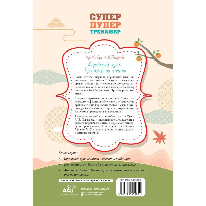 Давно хотите выучить корейский язык, но не знаете, с чего начать? Начните с алфавита и правил чтения! Корейское письмо хангыль может отпугивать тех, кто знаком только с письменностью английского или немецкого языков, однако благодаря учебному пособию "Корейский язык. Тренажер по чтению" вы с легкостью овладеете корейским алфавитом. В книге представлено написание всех букв корейского алфавита хангыль, тщательно описаны обозначаемые ими звуки, объясняются особенности записи корейских слогов и правила их чтения. Весь материал логично разбит на 15 небольших понятно написанных уроков, что облегчает поиск нужной буквы или правила. Каждый урок сопровождается упражнениями, количество которых постепенно возрастает, что позволяет отточить новые навыки и ощутить свой прогресс. Ключи к упражнениям приведены в конце книги. Авторы этого учебного пособия Чун Ин Сун и А. В. Погадаева признанные специалисты в области корейского языка и корейской литературы, преподаватели Института стран Азии и Африки МГУ и Института восточн