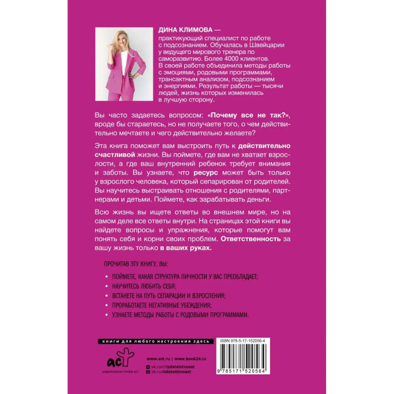 Дина Климова практикующий специалист по работе с подсознанием. В своей работе объединила методы работы с эмоциями, родовыми программами, трансактным анализом, подсознанием и энергиями. Вы часто задаетесь вопросом: "Почему все не так?", вроде бы стараетесь, но не получаете того, о чем действительно мечтаете и чего действительно желаете? Книга "F#ck! Почему все не так? Как стать взрослым ресурсным человеком" поможет вам выстроить путь к действительно счастливой жизни. Вы поймете, где вам не хватает взрослости, а где ваш внутренний ребенок требует внимания и заботы. Вы узнаете, что ресурс может быть только у взрослого человека, который сепарирован от родителей. Вы научитесь выстраивать отношения с родителями, партнерами и детьми. Поймете, как зарабатывать деньги. Всю жизнь вы ищете ответы во внешнем мире, но на самом деле все ответы внутри. На страницах книги "F#ck! Почему все не так? Как стать взрослым ресурсным человеком" вы найдете вопросы и упражнения, которые помогут вам понять себя и корни своих пробле
