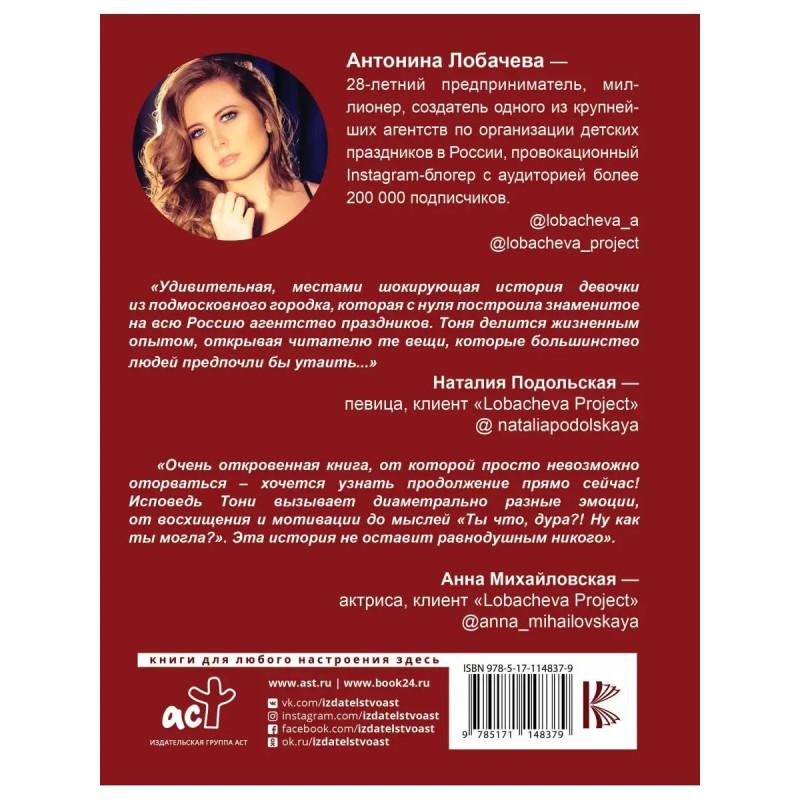 Шокирующая история успеха 28-летней девушки-предпринимателя Антонины Лобачевой. В 21 году Тоня начала работать детским аниматором, назначив за свою работу самую низкую цену в подмосковном городке. Сегодня Антонина миллионер и владелица одного из крупнейших агентств детских праздников в России. Как ей это удалось? Ответы вы найдете в этой книге. История с первых страниц поражает своей откровенностью и искренностью далеко не каждый человек мог бы рассказать даже близким людям то, на что решилась эта смелая и немного странная девушка. В книге вы найдете более 3 советов по достижению успеха, которые автору удалось извлечь из весьма непростых жизненных уроков. История написана эмоционально и с потрясающей самоиронией. Единственный минус этой книги в том, что вы не сможете остановиться начав читать ее, вы будете жаждать продолжения снова и снова! Эта книга глоток свежего воздуха, после которого ваша жизнь никогда не станет прежней....