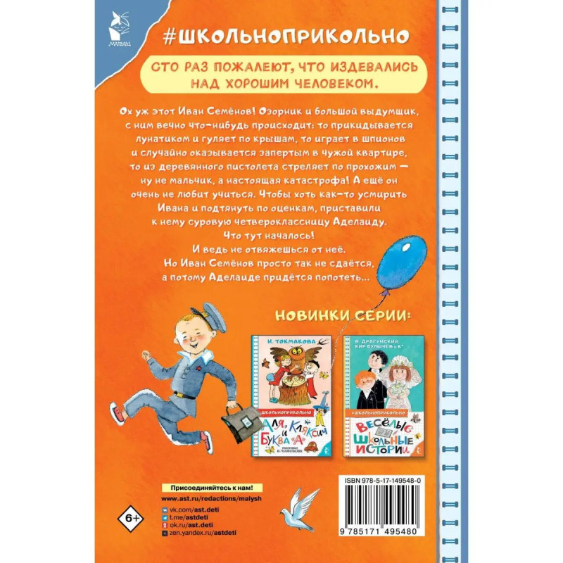 Ох уж этот Иван Семёнов! Озорник и большой выдумщик, с ним вечно что-нибудь происходит: то прикидывается лунатиком и гуляет по крышам, то играет в шпионов и случайно оказывается запертым в чужой квартире, то из деревянного пистолета стреляет по прохожим ну не мальчик, а настоящая катастрофа! А ещё он очень не любит учиться. Чтобы хоть как-то усмирить Ивана и подтянуть по оценкам, приставили к нему суровую четвероклассницу Аделаиду. Что тут началось! И ведь не отвяжешься от неё. Но Иван Семёнов просто так не сдаётся, а потому Аделаиде придётся попотеть
