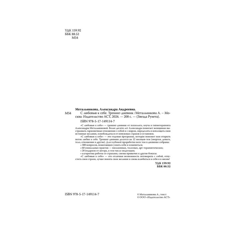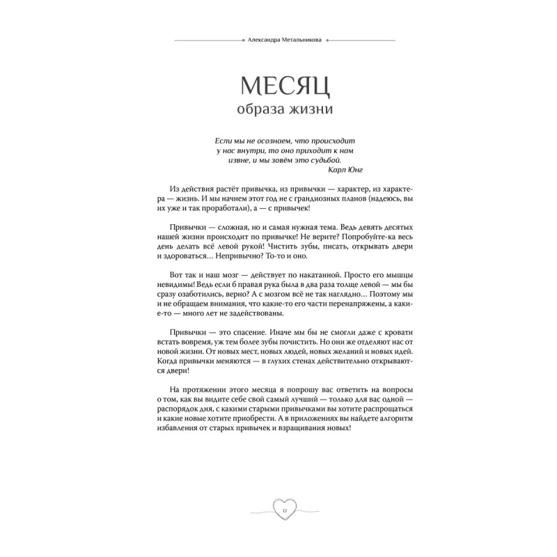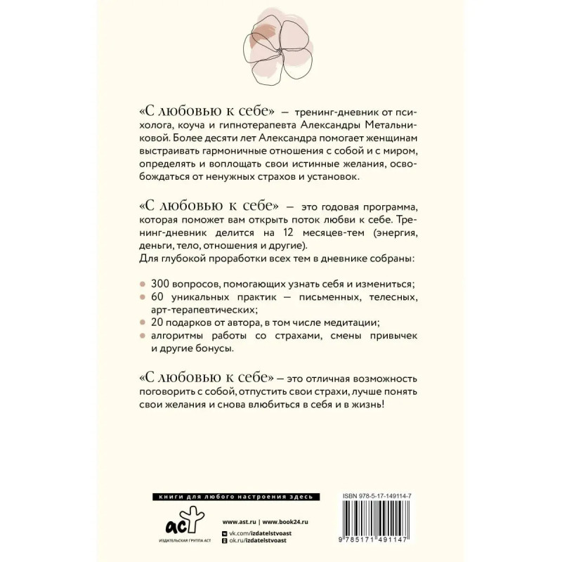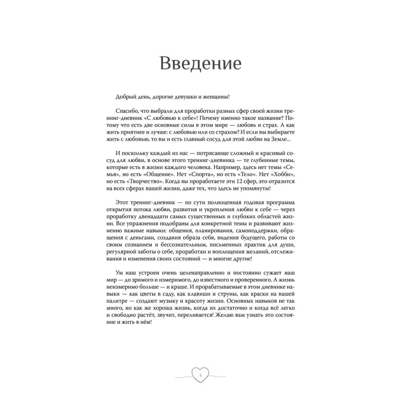 Тренинг-дневник С любовью к себе поможет вам проработать двенадцать самых существенных и глубоких областей жизни. Все упражнения подобраны для конкретной темы и развивают жизненно важные навыки: общения, планирования, самоподдержки, обращения с деньгами, создания образа себя, видения будущего, работы со своим сознанием и бессознательным, письменных практик для души, регулярной заботы о себе, проработки и воплощения желаний, отслеживания и изменения своих состояний и многие другие!