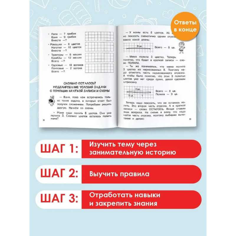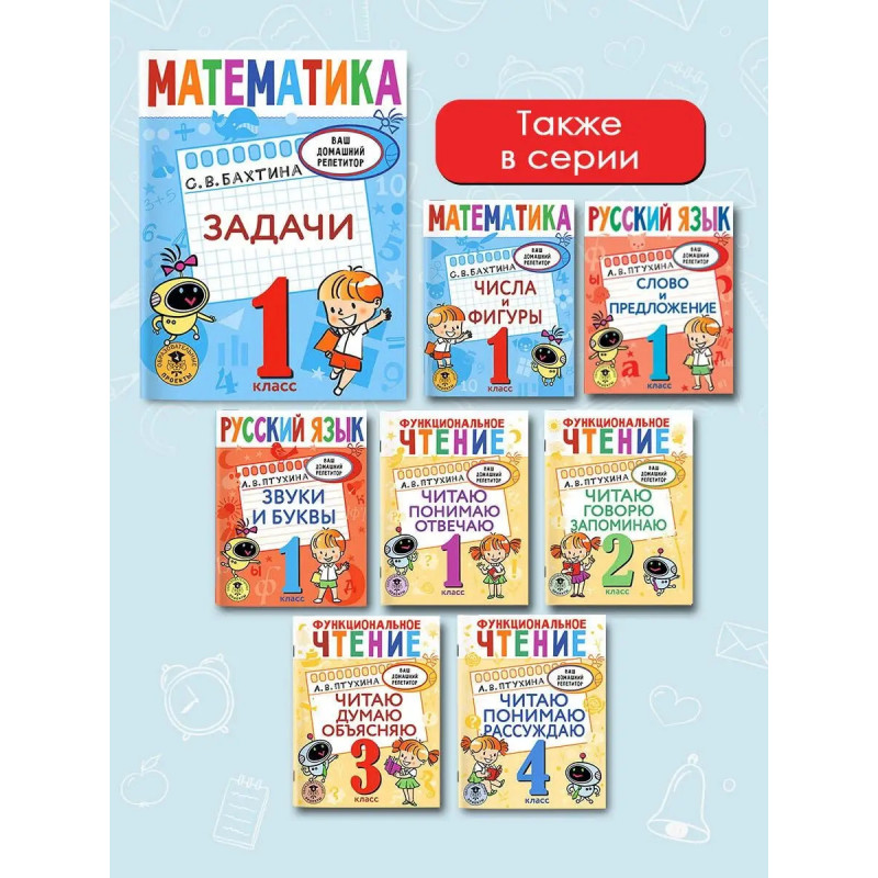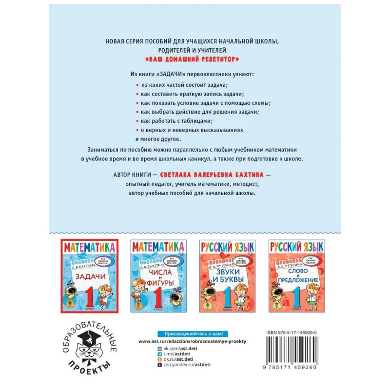 Новая серия пособий для начальной школы, родителей и учителей Ваш домашний репетитор. Из книги Задачи первоклассники узнают всё о задачах: какие бывают задачи и как они решаются: в одно действие; с помощью краткой записи и схемы; а также: как извлекать данные из таблицы; как вносить данные в таблицу; как измерить длину геометрической фигуры и многое другое. Заниматься по пособию можно параллельно с любым учебником русского языка, а также во время школьных каникул и даже при подготовке к школе. Автор книги Светлана Валерьевна Бахтина опытный педагог, учитель математики, методист, автор учебных пособий для начальной школы.
