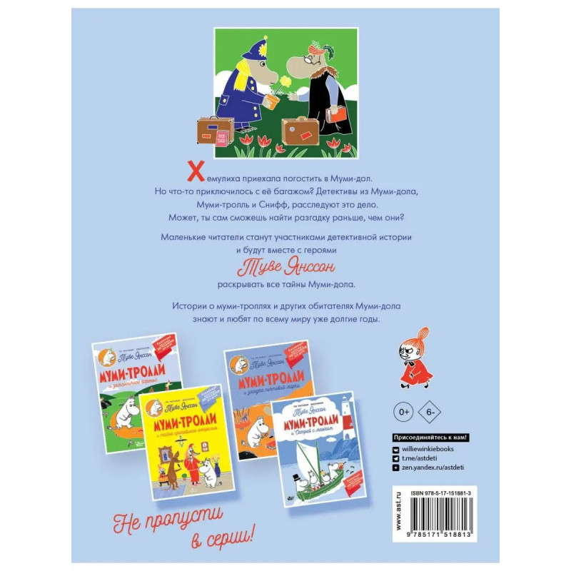 Хемулиха приехала погостить в Муми-дол. Но что-то приключилось с её багажом? Детективы из Муми-дола, Муми-тролль и Снифф, расследуют это дело. Может, ты сам сможешь найти разгадку раньше, чем они? Маленькие читатели станут участниками детективной истории и будут вместе с героями Туве Янссон раскрывать все тайны Муми-дола. Для детей до 3-х лет.
